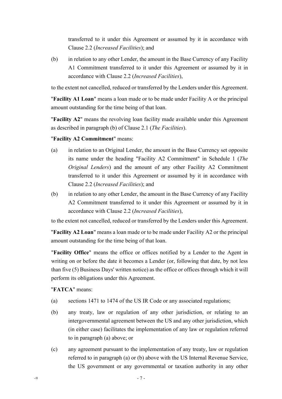 -/0 - 7 - transferred to it under this Agreement or assumed by it in accordance with Clause 2.2 (Increased Facilities); and (b) in relation to any other Lender, the amount in the Base Currency of any Facility A1 Commitment transferred to it under this Agreement or assumed by it in accordance with Clause 2.2 (Increased Facilities), to the extent not cancelled, reduced or transferred by the Lenders under this Agreement. "Facility A1 Loan" means a loan made or to be made under Facility A or the principal amount outstanding for the time being of that loan. "Facility A2" means the revolving loan facility made available under this Agreement as described in paragraph (b) of Clause 2.1 (The Facilities). "Facility A2 Commitment" means: (a) in relation to an Original Lender, the amount in the Base Currency set opposite its name under the heading "Facility A2 Commitment" in Schedule 1 (The Original Lenders) and the amount of any other Facility A2 Commitment transferred to it under this Agreement or assumed by it in accordance with Clause 2.2 (Increased Facilities); and (b) in relation to any other Lender, the amount in the Base Currency of any Facility A2 Commitment transferred to it under this Agreement or assumed by it in accordance with Clause 2.2 (Increased Facilities), to the extent not cancelled, reduced or transferred by the Lenders under this Agreement. "Facility A2 Loan" means a loan made or to be made under Facility A2 or the principal amount outstanding for the time being of that loan. "Facility Office" means the office or offices notified by a Lender to the Agent in writing on or before the date it becomes a Lender (or, following that date, by not less than five (5) Business Days' written notice) as the office or offices through which it will perform its obligations under this Agreement. "FATCA" means: (a) sections 1471 to 1474 of the US IR Code or any associated regulations; (b) any treaty, law or regulation of any other jurisdiction, or relating to an intergovernmental agreement between the US and any other jurisdiction, which (in either case) facilitates the implementation of any law or regulation referred to in paragraph (a) above; or (c) any agreement pursuant to the implementation of any treaty, law or regulation referred to in paragraph (a) or (b) above with the US Internal Revenue Service, the US government or any governmental or taxation authority in any other