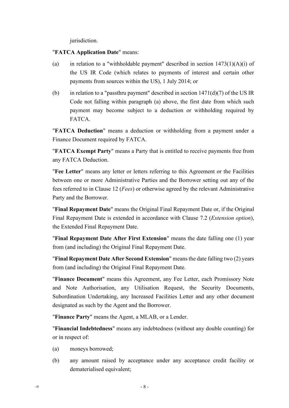 -/0 - 8 - jurisdiction. "FATCA Application Date" means: (a) in relation to a "withholdable payment" described in section 1473(1)(A)(i) of the US IR Code (which relates to payments of interest and certain other payments from sources within the US), 1 July 2014; or (b) in relation to a "passthru payment" described in section 1471(d)(7) of the US IR Code not falling within paragraph (a) above, the first date from which such payment may become subject to a deduction or withholding required by FATCA. "FATCA Deduction" means a deduction or withholding from a payment under a Finance Document required by FATCA. "FATCA Exempt Party" means a Party that is entitled to receive payments free from any FATCA Deduction. "Fee Letter" means any letter or letters referring to this Agreement or the Facilities between one or more Administrative Parties and the Borrower setting out any of the fees referred to in Clause 12 (Fees) or otherwise agreed by the relevant Administrative Party and the Borrower. "Final Repayment Date" means the Original Final Repayment Date or, if the Original Final Repayment Date is extended in accordance with Clause 7.2 (Extension option), the Extended Final Repayment Date. "Final Repayment Date After First Extension" means the date falling one (1) year from (and including) the Original Final Repayment Date. "Final Repayment Date After Second Extension" means the date falling two (2) years from (and including) the Original Final Repayment Date. "Finance Document" means this Agreement, any Fee Letter, each Promissory Note and Note Authorisation, any Utilisation Request, the Security Documents, Subordination Undertaking, any Increased Facilities Letter and any other document designated as such by the Agent and the Borrower. "Finance Party" means the Agent, a MLAB, or a Lender. "Financial Indebtedness" means any indebtedness (without any double counting) for or in respect of: (a) moneys borrowed; (b) any amount raised by acceptance under any acceptance credit facility or dematerialised equivalent;