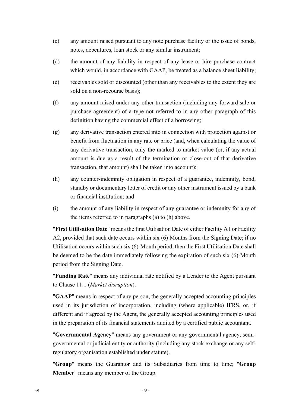 -/0 - 9 - (c) any amount raised pursuant to any note purchase facility or the issue of bonds, notes, debentures, loan stock or any similar instrument; (d) the amount of any liability in respect of any lease or hire purchase contract which would, in accordance with GAAP, be treated as a balance sheet liability; (e) receivables sold or discounted (other than any receivables to the extent they are sold on a non-recourse basis); (f) any amount raised under any other transaction (including any forward sale or purchase agreement) of a type not referred to in any other paragraph of this definition having the commercial effect of a borrowing; (g) any derivative transaction entered into in connection with protection against or benefit from fluctuation in any rate or price (and, when calculating the value of any derivative transaction, only the marked to market value (or, if any actual amount is due as a result of the termination or close-out of that derivative transaction, that amount) shall be taken into account); (h) any counter-indemnity obligation in respect of a guarantee, indemnity, bond, standby or documentary letter of credit or any other instrument issued by a bank or financial institution; and (i) the amount of any liability in respect of any guarantee or indemnity for any of the items referred to in paragraphs (a) to (h) above. "First Utilisation Date" means the first Utilisation Date of either Facility A1 or Facility A2, provided that such date occurs within six (6) Months from the Signing Date; if no Utilisation occurs within such six (6)-Month period, then the First Utilisation Date shall be deemed to be the date immediately following the expiration of such six (6)-Month period from the Signing Date. "Funding Rate" means any individual rate notified by a Lender to the Agent pursuant to Clause 11.1 (Market disruption). "GAAP" means in respect of any person, the generally accepted accounting principles used in its jurisdiction of incorporation, including (where applicable) IFRS, or, if different and if agreed by the Agent, the generally accepted accounting principles used in the preparation of its financial statements audited by a certified public accountant. "Governmental Agency" means any government or any governmental agency, semi- governmental or judicial entity or authority (including any stock exchange or any self- regulatory organisation established under statute). "Group" means the Guarantor and its Subsidiaries from time to time; "Group Member" means any member of the Group.