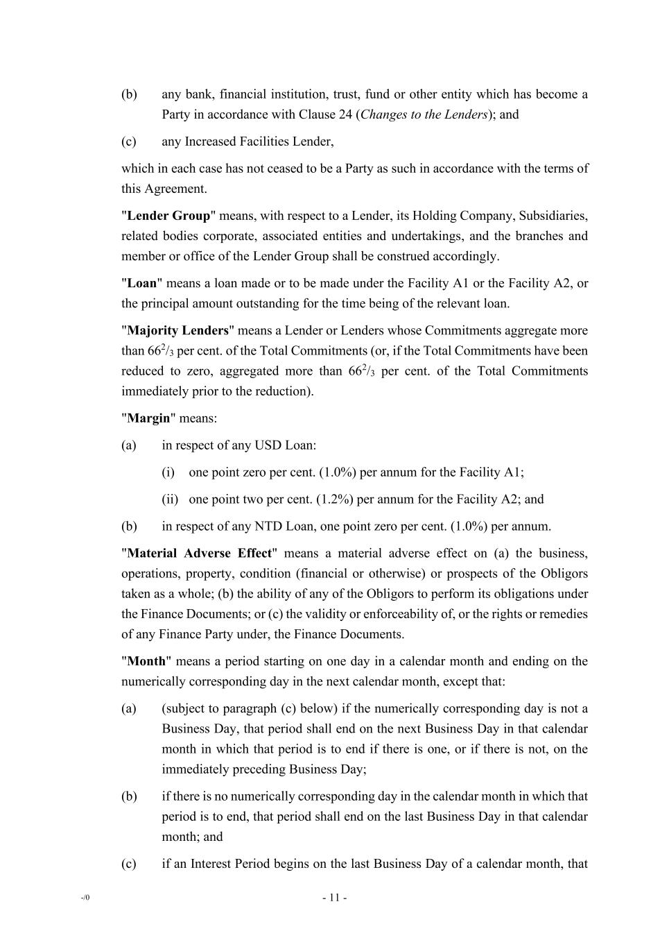 -/0 - 11 - (b) any bank, financial institution, trust, fund or other entity which has become a Party in accordance with Clause 24 (Changes to the Lenders); and (c) any Increased Facilities Lender, which in each case has not ceased to be a Party as such in accordance with the terms of this Agreement. "Lender Group" means, with respect to a Lender, its Holding Company, Subsidiaries, related bodies corporate, associated entities and undertakings, and the branches and member or office of the Lender Group shall be construed accordingly. "Loan" means a loan made or to be made under the Facility A1 or the Facility A2, or the principal amount outstanding for the time being of the relevant loan. "Majority Lenders" means a Lender or Lenders whose Commitments aggregate more than 662/3 per cent. of the Total Commitments (or, if the Total Commitments have been reduced to zero, aggregated more than 662/3 per cent. of the Total Commitments immediately prior to the reduction). "Margin" means: (a) in respect of any USD Loan: (i) one point zero per cent. (1.0%) per annum for the Facility A1; (ii) one point two per cent. (1.2%) per annum for the Facility A2; and (b) in respect of any NTD Loan, one point zero per cent. (1.0%) per annum. "Material Adverse Effect" means a material adverse effect on (a) the business, operations, property, condition (financial or otherwise) or prospects of the Obligors taken as a whole; (b) the ability of any of the Obligors to perform its obligations under the Finance Documents; or (c) the validity or enforceability of, or the rights or remedies of any Finance Party under, the Finance Documents. "Month" means a period starting on one day in a calendar month and ending on the numerically corresponding day in the next calendar month, except that: (a) (subject to paragraph (c) below) if the numerically corresponding day is not a Business Day, that period shall end on the next Business Day in that calendar month in which that period is to end if there is one, or if there is not, on the immediately preceding Business Day; (b) if there is no numerically corresponding day in the calendar month in which that period is to end, that period shall end on the last Business Day in that calendar month; and (c) if an Interest Period begins on the last Business Day of a calendar month, that