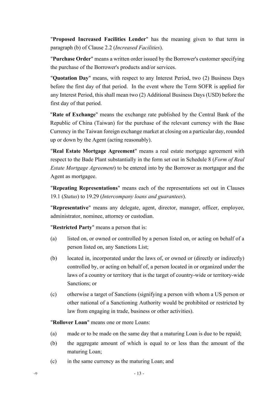-/0 - 13 - "Proposed Increased Facilities Lender" has the meaning given to that term in paragraph (b) of Clause 2.2 (Increased Facilities). "Purchase Order" means a written order issued by the Borrower's customer specifying the purchase of the Borrower's products and/or services. "Quotation Day" means, with respect to any Interest Period, two (2) Business Days before the first day of that period. In the event where the Term SOFR is applied for any Interest Period, this shall mean two (2) Additional Business Days (USD) before the first day of that period. "Rate of Exchange" means the exchange rate published by the Central Bank of the Republic of China (Taiwan) for the purchase of the relevant currency with the Base Currency in the Taiwan foreign exchange market at closing on a particular day, rounded up or down by the Agent (acting reasonably). "Real Estate Mortgage Agreement" means a real estate mortgage agreement with respect to the Bade Plant substantially in the form set out in Schedule 8 (Form of Real Estate Mortgage Agreement) to be entered into by the Borrower as mortgagor and the Agent as mortgagee. "Repeating Representations" means each of the representations set out in Clauses 19.1 (Status) to 19.29 (Intercompany loans and guarantees). "Representative" means any delegate, agent, director, manager, officer, employee, administrator, nominee, attorney or custodian. "Restricted Party" means a person that is: (a) listed on, or owned or controlled by a person listed on, or acting on behalf of a person listed on, any Sanctions List; (b) located in, incorporated under the laws of, or owned or (directly or indirectly) controlled by, or acting on behalf of, a person located in or organized under the laws of a country or territory that is the target of country-wide or territory-wide Sanctions; or (c) otherwise a target of Sanctions (signifying a person with whom a US person or other national of a Sanctioning Authority would be prohibited or restricted by law from engaging in trade, business or other activities). "Rollover Loan" means one or more Loans: (a) made or to be made on the same day that a maturing Loan is due to be repaid; (b) the aggregate amount of which is equal to or less than the amount of the maturing Loan; (c) in the same currency as the maturing Loan; and