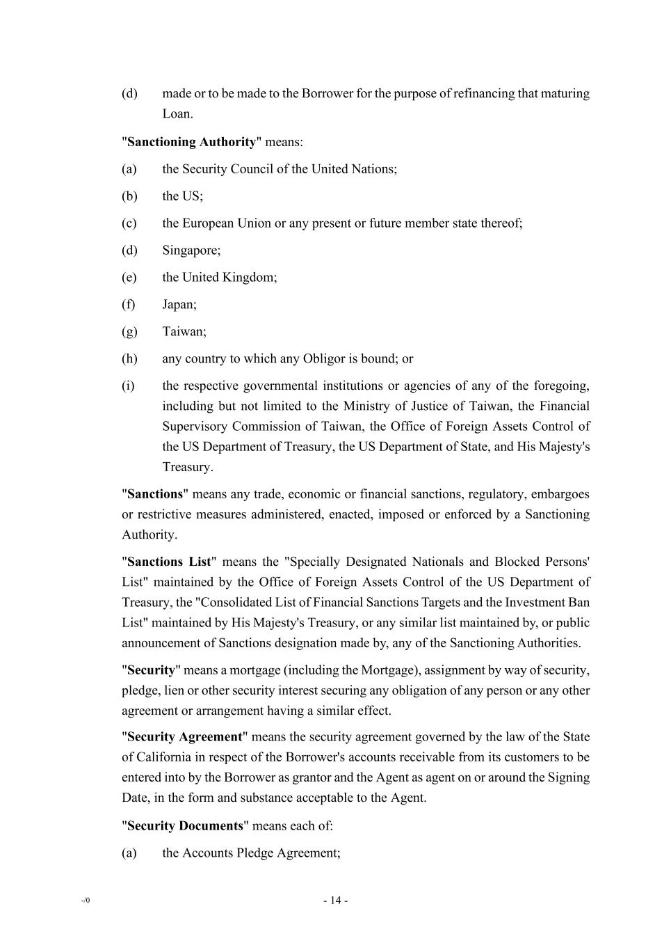 -/0 - 14 - (d) made or to be made to the Borrower for the purpose of refinancing that maturing Loan. "Sanctioning Authority" means: (a) the Security Council of the United Nations; (b) the US; (c) the European Union or any present or future member state thereof; (d) Singapore; (e) the United Kingdom; (f) Japan; (g) Taiwan; (h) any country to which any Obligor is bound; or (i) the respective governmental institutions or agencies of any of the foregoing, including but not limited to the Ministry of Justice of Taiwan, the Financial Supervisory Commission of Taiwan, the Office of Foreign Assets Control of the US Department of Treasury, the US Department of State, and His Majesty's Treasury. "Sanctions" means any trade, economic or financial sanctions, regulatory, embargoes or restrictive measures administered, enacted, imposed or enforced by a Sanctioning Authority. "Sanctions List" means the "Specially Designated Nationals and Blocked Persons' List" maintained by the Office of Foreign Assets Control of the US Department of Treasury, the "Consolidated List of Financial Sanctions Targets and the Investment Ban List" maintained by His Majesty's Treasury, or any similar list maintained by, or public announcement of Sanctions designation made by, any of the Sanctioning Authorities. "Security" means a mortgage (including the Mortgage), assignment by way of security, pledge, lien or other security interest securing any obligation of any person or any other agreement or arrangement having a similar effect. "Security Agreement" means the security agreement governed by the law of the State of California in respect of the Borrower's accounts receivable from its customers to be entered into by the Borrower as grantor and the Agent as agent on or around the Signing Date, in the form and substance acceptable to the Agent. "Security Documents" means each of: (a) the Accounts Pledge Agreement;