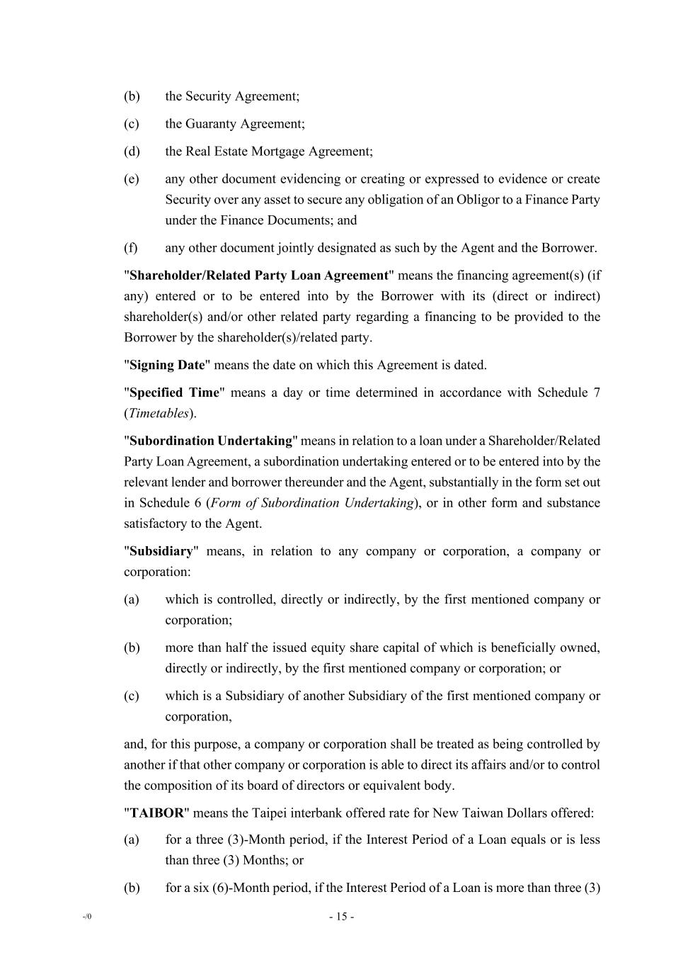 -/0 - 15 - (b) the Security Agreement; (c) the Guaranty Agreement; (d) the Real Estate Mortgage Agreement; (e) any other document evidencing or creating or expressed to evidence or create Security over any asset to secure any obligation of an Obligor to a Finance Party under the Finance Documents; and (f) any other document jointly designated as such by the Agent and the Borrower. "Shareholder/Related Party Loan Agreement" means the financing agreement(s) (if any) entered or to be entered into by the Borrower with its (direct or indirect) shareholder(s) and/or other related party regarding a financing to be provided to the Borrower by the shareholder(s)/related party. "Signing Date" means the date on which this Agreement is dated. "Specified Time" means a day or time determined in accordance with Schedule 7 (Timetables). "Subordination Undertaking" means in relation to a loan under a Shareholder/Related Party Loan Agreement, a subordination undertaking entered or to be entered into by the relevant lender and borrower thereunder and the Agent, substantially in the form set out in Schedule 6 (Form of Subordination Undertaking), or in other form and substance satisfactory to the Agent. "Subsidiary" means, in relation to any company or corporation, a company or corporation: (a) which is controlled, directly or indirectly, by the first mentioned company or corporation; (b) more than half the issued equity share capital of which is beneficially owned, directly or indirectly, by the first mentioned company or corporation; or (c) which is a Subsidiary of another Subsidiary of the first mentioned company or corporation, and, for this purpose, a company or corporation shall be treated as being controlled by another if that other company or corporation is able to direct its affairs and/or to control the composition of its board of directors or equivalent body. "TAIBOR" means the Taipei interbank offered rate for New Taiwan Dollars offered: (a) for a three (3)-Month period, if the Interest Period of a Loan equals or is less than three (3) Months; or (b) for a six (6)-Month period, if the Interest Period of a Loan is more than three (3)
