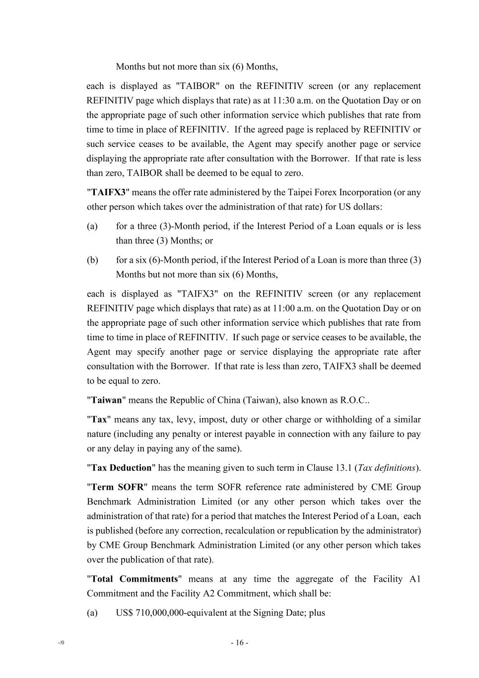 -/0 - 16 - Months but not more than six (6) Months, each is displayed as "TAIBOR" on the REFINITIV screen (or any replacement REFINITIV page which displays that rate) as at 11:30 a.m. on the Quotation Day or on the appropriate page of such other information service which publishes that rate from time to time in place of REFINITIV. If the agreed page is replaced by REFINITIV or such service ceases to be available, the Agent may specify another page or service displaying the appropriate rate after consultation with the Borrower. If that rate is less than zero, TAIBOR shall be deemed to be equal to zero. "TAIFX3" means the offer rate administered by the Taipei Forex Incorporation (or any other person which takes over the administration of that rate) for US dollars: (a) for a three (3)-Month period, if the Interest Period of a Loan equals or is less than three (3) Months; or (b) for a six (6)-Month period, if the Interest Period of a Loan is more than three (3) Months but not more than six (6) Months, each is displayed as "TAIFX3" on the REFINITIV screen (or any replacement REFINITIV page which displays that rate) as at 11:00 a.m. on the Quotation Day or on the appropriate page of such other information service which publishes that rate from time to time in place of REFINITIV. If such page or service ceases to be available, the Agent may specify another page or service displaying the appropriate rate after consultation with the Borrower. If that rate is less than zero, TAIFX3 shall be deemed to be equal to zero. "Taiwan" means the Republic of China (Taiwan), also known as R.O.C.. "Tax" means any tax, levy, impost, duty or other charge or withholding of a similar nature (including any penalty or interest payable in connection with any failure to pay or any delay in paying any of the same). "Tax Deduction" has the meaning given to such term in Clause 13.1 (Tax definitions). "Term SOFR" means the term SOFR reference rate administered by CME Group Benchmark Administration Limited (or any other person which takes over the administration of that rate) for a period that matches the Interest Period of a Loan, each is published (before any correction, recalculation or republication by the administrator) by CME Group Benchmark Administration Limited (or any other person which takes over the publication of that rate). "Total Commitments" means at any time the aggregate of the Facility A1 Commitment and the Facility A2 Commitment, which shall be: (a) US$ 710,000,000-equivalent at the Signing Date; plus