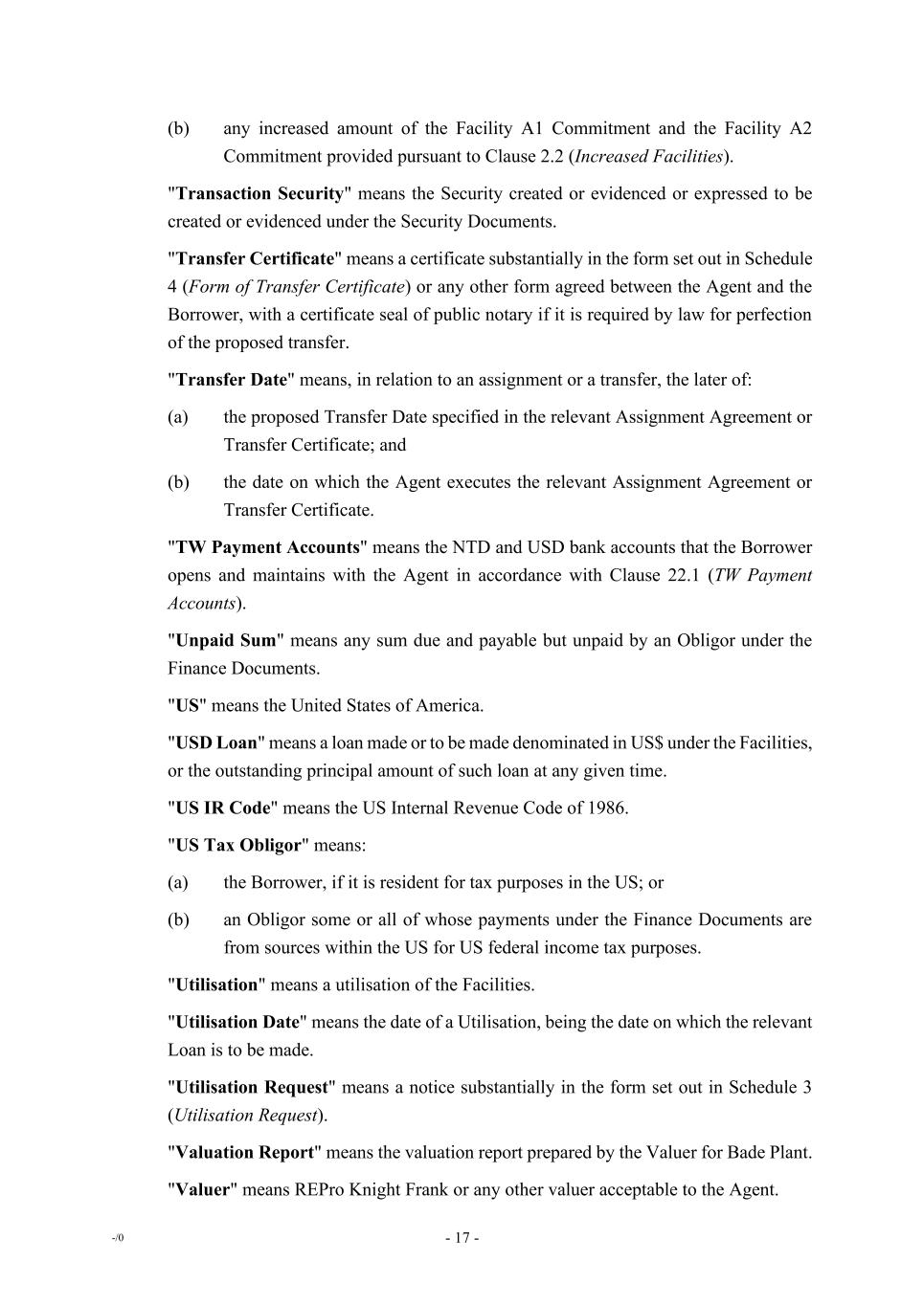 -/0 - 17 - (b) any increased amount of the Facility A1 Commitment and the Facility A2 Commitment provided pursuant to Clause 2.2 (Increased Facilities). "Transaction Security" means the Security created or evidenced or expressed to be created or evidenced under the Security Documents. "Transfer Certificate" means a certificate substantially in the form set out in Schedule 4 (Form of Transfer Certificate) or any other form agreed between the Agent and the Borrower, with a certificate seal of public notary if it is required by law for perfection of the proposed transfer. "Transfer Date" means, in relation to an assignment or a transfer, the later of: (a) the proposed Transfer Date specified in the relevant Assignment Agreement or Transfer Certificate; and (b) the date on which the Agent executes the relevant Assignment Agreement or Transfer Certificate. "TW Payment Accounts" means the NTD and USD bank accounts that the Borrower opens and maintains with the Agent in accordance with Clause 22.1 (TW Payment Accounts). "Unpaid Sum" means any sum due and payable but unpaid by an Obligor under the Finance Documents. "US" means the United States of America. "USD Loan" means a loan made or to be made denominated in US$ under the Facilities, or the outstanding principal amount of such loan at any given time. "US IR Code" means the US Internal Revenue Code of 1986. "US Tax Obligor" means: (a) the Borrower, if it is resident for tax purposes in the US; or (b) an Obligor some or all of whose payments under the Finance Documents are from sources within the US for US federal income tax purposes. "Utilisation" means a utilisation of the Facilities. "Utilisation Date" means the date of a Utilisation, being the date on which the relevant Loan is to be made. "Utilisation Request" means a notice substantially in the form set out in Schedule 3 (Utilisation Request). "Valuation Report" means the valuation report prepared by the Valuer for Bade Plant. "Valuer" means REPro Knight Frank or any other valuer acceptable to the Agent.