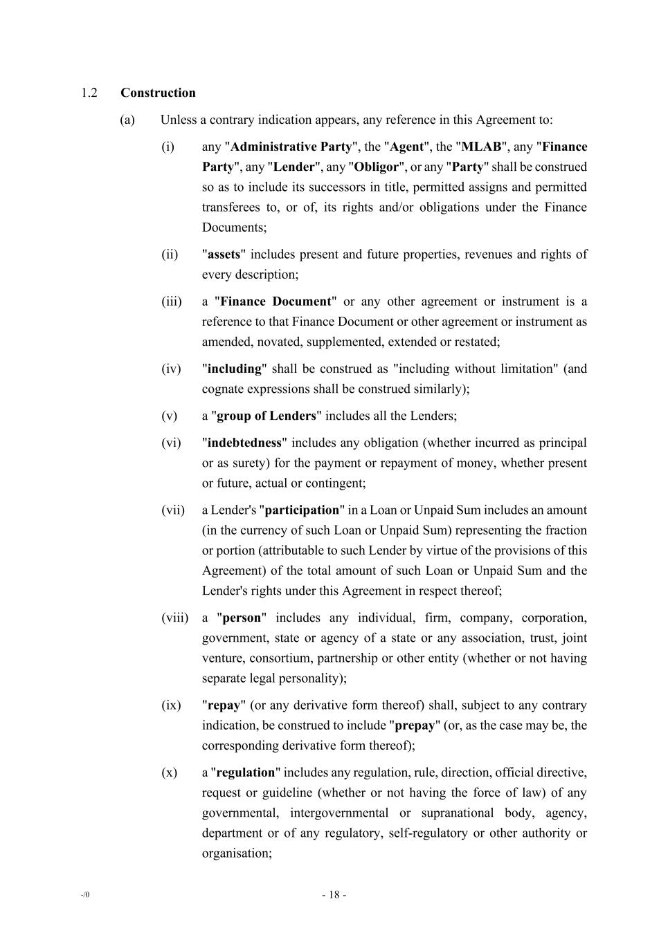 -/0 - 18 - 1.2 Construction (a) Unless a contrary indication appears, any reference in this Agreement to: (i) any "Administrative Party", the "Agent", the "MLAB", any "Finance Party", any "Lender", any "Obligor", or any "Party" shall be construed so as to include its successors in title, permitted assigns and permitted transferees to, or of, its rights and/or obligations under the Finance Documents; (ii) "assets" includes present and future properties, revenues and rights of every description; (iii) a "Finance Document" or any other agreement or instrument is a reference to that Finance Document or other agreement or instrument as amended, novated, supplemented, extended or restated; (iv) "including" shall be construed as "including without limitation" (and cognate expressions shall be construed similarly); (v) a "group of Lenders" includes all the Lenders; (vi) "indebtedness" includes any obligation (whether incurred as principal or as surety) for the payment or repayment of money, whether present or future, actual or contingent; (vii) a Lender's "participation" in a Loan or Unpaid Sum includes an amount (in the currency of such Loan or Unpaid Sum) representing the fraction or portion (attributable to such Lender by virtue of the provisions of this Agreement) of the total amount of such Loan or Unpaid Sum and the Lender's rights under this Agreement in respect thereof; (viii) a "person" includes any individual, firm, company, corporation, government, state or agency of a state or any association, trust, joint venture, consortium, partnership or other entity (whether or not having separate legal personality); (ix) "repay" (or any derivative form thereof) shall, subject to any contrary indication, be construed to include "prepay" (or, as the case may be, the corresponding derivative form thereof); (x) a "regulation" includes any regulation, rule, direction, official directive, request or guideline (whether or not having the force of law) of any governmental, intergovernmental or supranational body, agency, department or of any regulatory, self-regulatory or other authority or organisation;