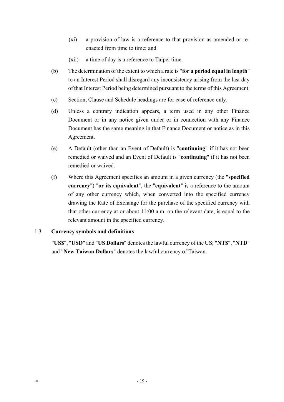 -/0 - 19 - (xi) a provision of law is a reference to that provision as amended or re- enacted from time to time; and (xii) a time of day is a reference to Taipei time. (b) The determination of the extent to which a rate is "for a period equal in length" to an Interest Period shall disregard any inconsistency arising from the last day of that Interest Period being determined pursuant to the terms of this Agreement. (c) Section, Clause and Schedule headings are for ease of reference only. (d) Unless a contrary indication appears, a term used in any other Finance Document or in any notice given under or in connection with any Finance Document has the same meaning in that Finance Document or notice as in this Agreement. (e) A Default (other than an Event of Default) is "continuing" if it has not been remedied or waived and an Event of Default is "continuing" if it has not been remedied or waived. (f) Where this Agreement specifies an amount in a given currency (the "specified currency") "or its equivalent", the "equivalent" is a reference to the amount of any other currency which, when converted into the specified currency drawing the Rate of Exchange for the purchase of the specified currency with that other currency at or about 11:00 a.m. on the relevant date, is equal to the relevant amount in the specified currency. 1.3 Currency symbols and definitions "US$", "USD" and "US Dollars" denotes the lawful currency of the US; "NT$", "NTD" and "New Taiwan Dollars" denotes the lawful currency of Taiwan.
