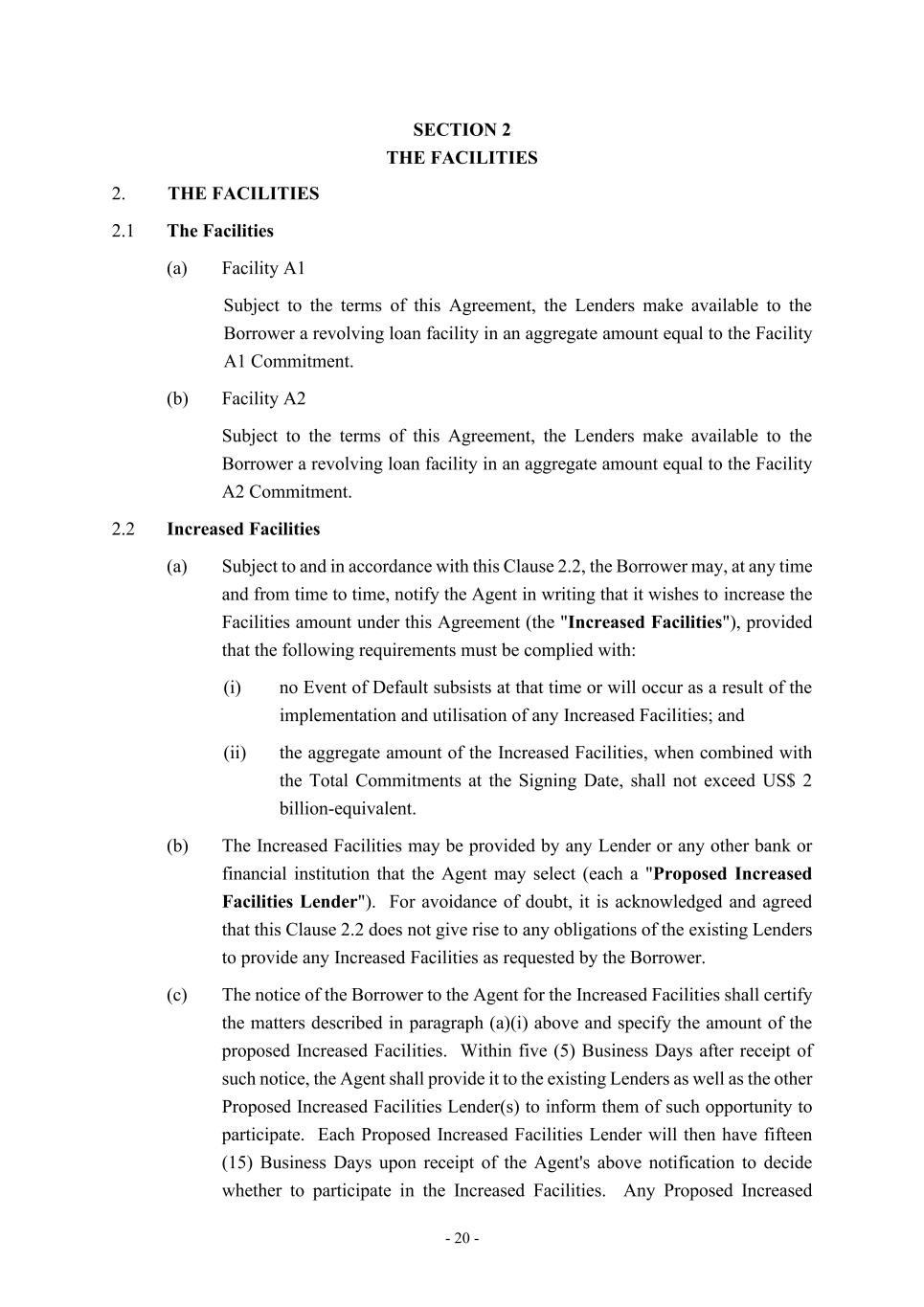 - 20 - SECTION 2 THE FACILITIES 2. THE FACILITIES 2.1 The Facilities (a) Facility A1 Subject to the terms of this Agreement, the Lenders make available to the Borrower a revolving loan facility in an aggregate amount equal to the Facility A1 Commitment. (b) Facility A2 Subject to the terms of this Agreement, the Lenders make available to the Borrower a revolving loan facility in an aggregate amount equal to the Facility A2 Commitment. 2.2 Increased Facilities (a) Subject to and in accordance with this Clause 2.2, the Borrower may, at any time and from time to time, notify the Agent in writing that it wishes to increase the Facilities amount under this Agreement (the "Increased Facilities"), provided that the following requirements must be complied with: (i) no Event of Default subsists at that time or will occur as a result of the implementation and utilisation of any Increased Facilities; and (ii) the aggregate amount of the Increased Facilities, when combined with the Total Commitments at the Signing Date, shall not exceed US$ 2 billion-equivalent. (b) The Increased Facilities may be provided by any Lender or any other bank or financial institution that the Agent may select (each a "Proposed Increased Facilities Lender"). For avoidance of doubt, it is acknowledged and agreed that this Clause 2.2 does not give rise to any obligations of the existing Lenders to provide any Increased Facilities as requested by the Borrower. (c) The notice of the Borrower to the Agent for the Increased Facilities shall certify the matters described in paragraph (a)(i) above and specify the amount of the proposed Increased Facilities. Within five (5) Business Days after receipt of such notice, the Agent shall provide it to the existing Lenders as well as the other Proposed Increased Facilities Lender(s) to inform them of such opportunity to participate. Each Proposed Increased Facilities Lender will then have fifteen (15) Business Days upon receipt of the Agent's above notification to decide whether to participate in the Increased Facilities. Any Proposed Increased