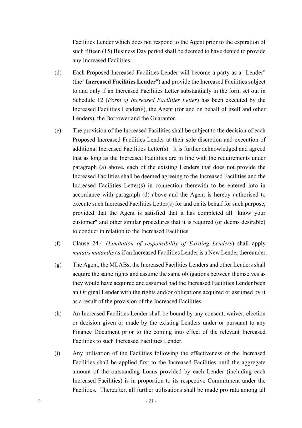 -/0 - 21 - Facilities Lender which does not respond to the Agent prior to the expiration of such fifteen (15) Business Day period shall be deemed to have denied to provide any Increased Facilities. (d) Each Proposed Increased Facilities Lender will become a party as a "Lender" (the "Increased Facilities Lender") and provide the Increased Facilities subject to and only if an Increased Facilities Letter substantially in the form set out in Schedule 12 (Form of Increased Facilities Letter) has been executed by the Increased Facilities Lender(s), the Agent (for and on behalf of itself and other Lenders), the Borrower and the Guarantor. (e) The provision of the Increased Facilities shall be subject to the decision of each Proposed Increased Facilities Lender at their sole discretion and execution of additional Increased Facilities Letter(s). It is further acknowledged and agreed that as long as the Increased Facilities are in line with the requirements under paragraph (a) above, each of the existing Lenders that does not provide the Increased Facilities shall be deemed agreeing to the Increased Facilities and the Increased Facilities Letter(s) in connection therewith to be entered into in accordance with paragraph (d) above and the Agent is hereby authorised to execute such Increased Facilities Letter(s) for and on its behalf for such purpose, provided that the Agent is satisfied that it has completed all "know your customer" and other similar procedures that it is required (or deems desirable) to conduct in relation to the Increased Facilities. (f) Clause 24.4 (Limitation of responsibility of Existing Lenders) shall apply mutatis mutandis as if an Increased Facilities Lender is a New Lender thereunder. (g) The Agent, the MLABs, the Increased Facilities Lenders and other Lenders shall acquire the same rights and assume the same obligations between themselves as they would have acquired and assumed had the Increased Facilities Lender been an Original Lender with the rights and/or obligations acquired or assumed by it as a result of the provision of the Increased Facilities. (h) An Increased Facilities Lender shall be bound by any consent, waiver, election or decision given or made by the existing Lenders under or pursuant to any Finance Document prior to the coming into effect of the relevant Increased Facilities to such Increased Facilities Lender. (i) Any utilisation of the Facilities following the effectiveness of the Increased Facilities shall be applied first to the Increased Facilities until the aggregate amount of the outstanding Loans provided by each Lender (including each Increased Facilities) is in proportion to its respective Commitment under the Facilities. Thereafter, all further utilisations shall be made pro rata among all