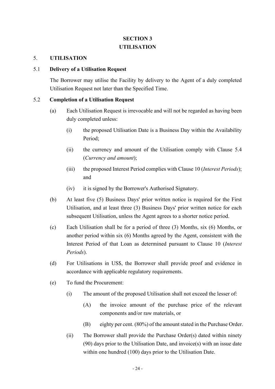 - 24 - SECTION 3 UTILISATION 5. UTILISATION 5.1 Delivery of a Utilisation Request The Borrower may utilise the Facility by delivery to the Agent of a duly completed Utilisation Request not later than the Specified Time. 5.2 Completion of a Utilisation Request (a) Each Utilisation Request is irrevocable and will not be regarded as having been duly completed unless: (i) the proposed Utilisation Date is a Business Day within the Availability Period; (ii) the currency and amount of the Utilisation comply with Clause 5.4 (Currency and amount); (iii) the proposed Interest Period complies with Clause 10 (Interest Periods); and (iv) it is signed by the Borrower's Authorised Signatory. (b) At least five (5) Business Days' prior written notice is required for the First Utilisation, and at least three (3) Business Days' prior written notice for each subsequent Utilisation, unless the Agent agrees to a shorter notice period. (c) Each Utilisation shall be for a period of three (3) Months, six (6) Months, or another period within six (6) Months agreed by the Agent, consistent with the Interest Period of that Loan as determined pursuant to Clause 10 (Interest Periods). (d) For Utilisations in US$, the Borrower shall provide proof and evidence in accordance with applicable regulatory requirements. (e) To fund the Procurement: (i) The amount of the proposed Utilisation shall not exceed the lesser of: (A) the invoice amount of the purchase price of the relevant components and/or raw materials, or (B) eighty per cent. (80%) of the amount stated in the Purchase Order. (ii) The Borrower shall provide the Purchase Order(s) dated within ninety (90) days prior to the Utilisation Date, and invoice(s) with an issue date within one hundred (100) days prior to the Utilisation Date.