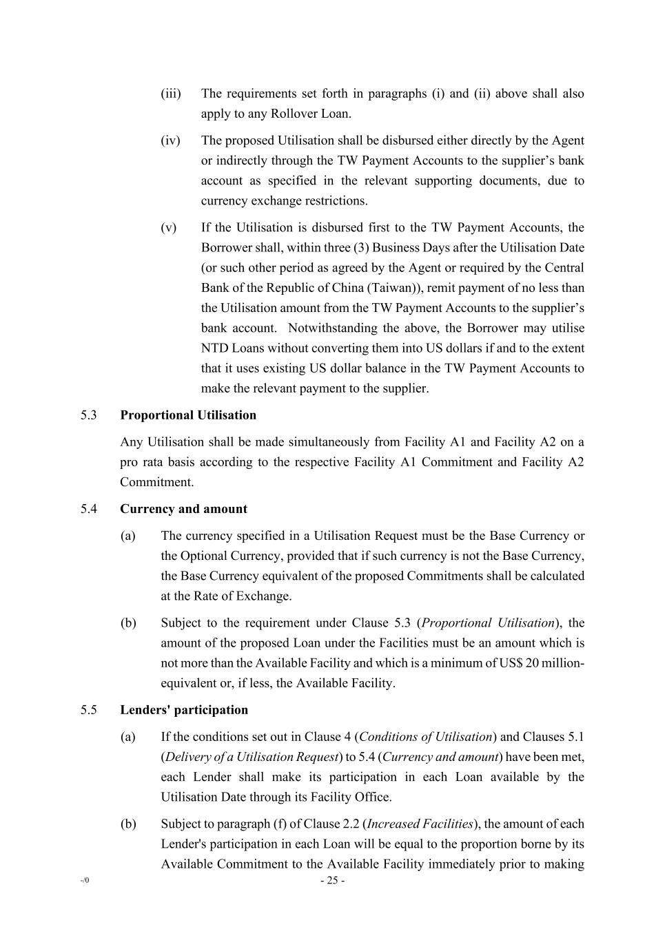 -/0 - 25 - (iii) The requirements set forth in paragraphs (i) and (ii) above shall also apply to any Rollover Loan. (iv) The proposed Utilisation shall be disbursed either directly by the Agent or indirectly through the TW Payment Accounts to the supplier’s bank account as specified in the relevant supporting documents, due to currency exchange restrictions. (v) If the Utilisation is disbursed first to the TW Payment Accounts, the Borrower shall, within three (3) Business Days after the Utilisation Date (or such other period as agreed by the Agent or required by the Central Bank of the Republic of China (Taiwan)), remit payment of no less than the Utilisation amount from the TW Payment Accounts to the supplier’s bank account. Notwithstanding the above, the Borrower may utilise NTD Loans without converting them into US dollars if and to the extent that it uses existing US dollar balance in the TW Payment Accounts to make the relevant payment to the supplier. 5.3 Proportional Utilisation Any Utilisation shall be made simultaneously from Facility A1 and Facility A2 on a pro rata basis according to the respective Facility A1 Commitment and Facility A2 Commitment. 5.4 Currency and amount (a) The currency specified in a Utilisation Request must be the Base Currency or the Optional Currency, provided that if such currency is not the Base Currency, the Base Currency equivalent of the proposed Commitments shall be calculated at the Rate of Exchange. (b) Subject to the requirement under Clause 5.3 (Proportional Utilisation), the amount of the proposed Loan under the Facilities must be an amount which is not more than the Available Facility and which is a minimum of US$ 20 million- equivalent or, if less, the Available Facility. 5.5 Lenders' participation (a) If the conditions set out in Clause 4 (Conditions of Utilisation) and Clauses 5.1 (Delivery of a Utilisation Request) to 5.4 (Currency and amount) have been met, each Lender shall make its participation in each Loan available by the Utilisation Date through its Facility Office. (b) Subject to paragraph (f) of Clause 2.2 (Increased Facilities), the amount of each Lender's participation in each Loan will be equal to the proportion borne by its Available Commitment to the Available Facility immediately prior to making