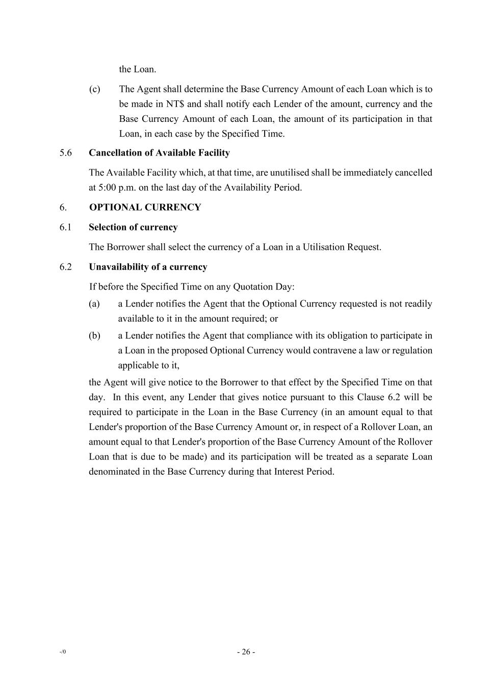 -/0 - 26 - the Loan. (c) The Agent shall determine the Base Currency Amount of each Loan which is to be made in NT$ and shall notify each Lender of the amount, currency and the Base Currency Amount of each Loan, the amount of its participation in that Loan, in each case by the Specified Time. 5.6 Cancellation of Available Facility The Available Facility which, at that time, are unutilised shall be immediately cancelled at 5:00 p.m. on the last day of the Availability Period. 6. OPTIONAL CURRENCY 6.1 Selection of currency The Borrower shall select the currency of a Loan in a Utilisation Request. 6.2 Unavailability of a currency If before the Specified Time on any Quotation Day: (a) a Lender notifies the Agent that the Optional Currency requested is not readily available to it in the amount required; or (b) a Lender notifies the Agent that compliance with its obligation to participate in a Loan in the proposed Optional Currency would contravene a law or regulation applicable to it, the Agent will give notice to the Borrower to that effect by the Specified Time on that day. In this event, any Lender that gives notice pursuant to this Clause 6.2 will be required to participate in the Loan in the Base Currency (in an amount equal to that Lender's proportion of the Base Currency Amount or, in respect of a Rollover Loan, an amount equal to that Lender's proportion of the Base Currency Amount of the Rollover Loan that is due to be made) and its participation will be treated as a separate Loan denominated in the Base Currency during that Interest Period.