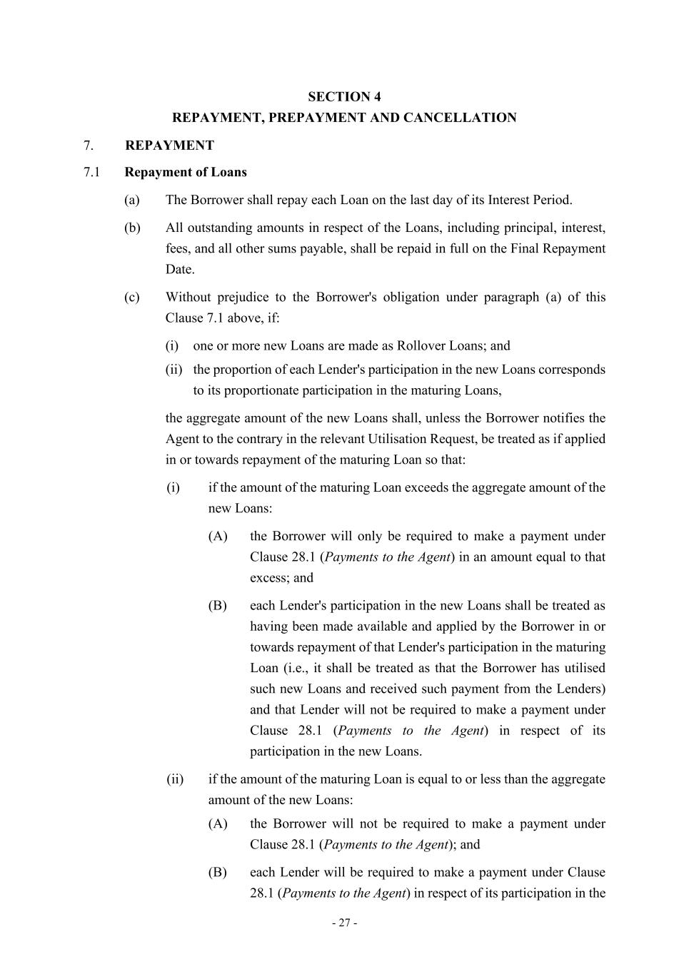 - 27 - SECTION 4 REPAYMENT, PREPAYMENT AND CANCELLATION 7. REPAYMENT 7.1 Repayment of Loans (a) The Borrower shall repay each Loan on the last day of its Interest Period. (b) All outstanding amounts in respect of the Loans, including principal, interest, fees, and all other sums payable, shall be repaid in full on the Final Repayment Date. (c) Without prejudice to the Borrower's obligation under paragraph (a) of this Clause 7.1 above, if: (i) one or more new Loans are made as Rollover Loans; and (ii) the proportion of each Lender's participation in the new Loans corresponds to its proportionate participation in the maturing Loans, the aggregate amount of the new Loans shall, unless the Borrower notifies the Agent to the contrary in the relevant Utilisation Request, be treated as if applied in or towards repayment of the maturing Loan so that: (i) if the amount of the maturing Loan exceeds the aggregate amount of the new Loans: (A) the Borrower will only be required to make a payment under Clause 28.1 (Payments to the Agent) in an amount equal to that excess; and (B) each Lender's participation in the new Loans shall be treated as having been made available and applied by the Borrower in or towards repayment of that Lender's participation in the maturing Loan (i.e., it shall be treated as that the Borrower has utilised such new Loans and received such payment from the Lenders) and that Lender will not be required to make a payment under Clause 28.1 (Payments to the Agent) in respect of its participation in the new Loans. (ii) if the amount of the maturing Loan is equal to or less than the aggregate amount of the new Loans: (A) the Borrower will not be required to make a payment under Clause 28.1 (Payments to the Agent); and (B) each Lender will be required to make a payment under Clause 28.1 (Payments to the Agent) in respect of its participation in the