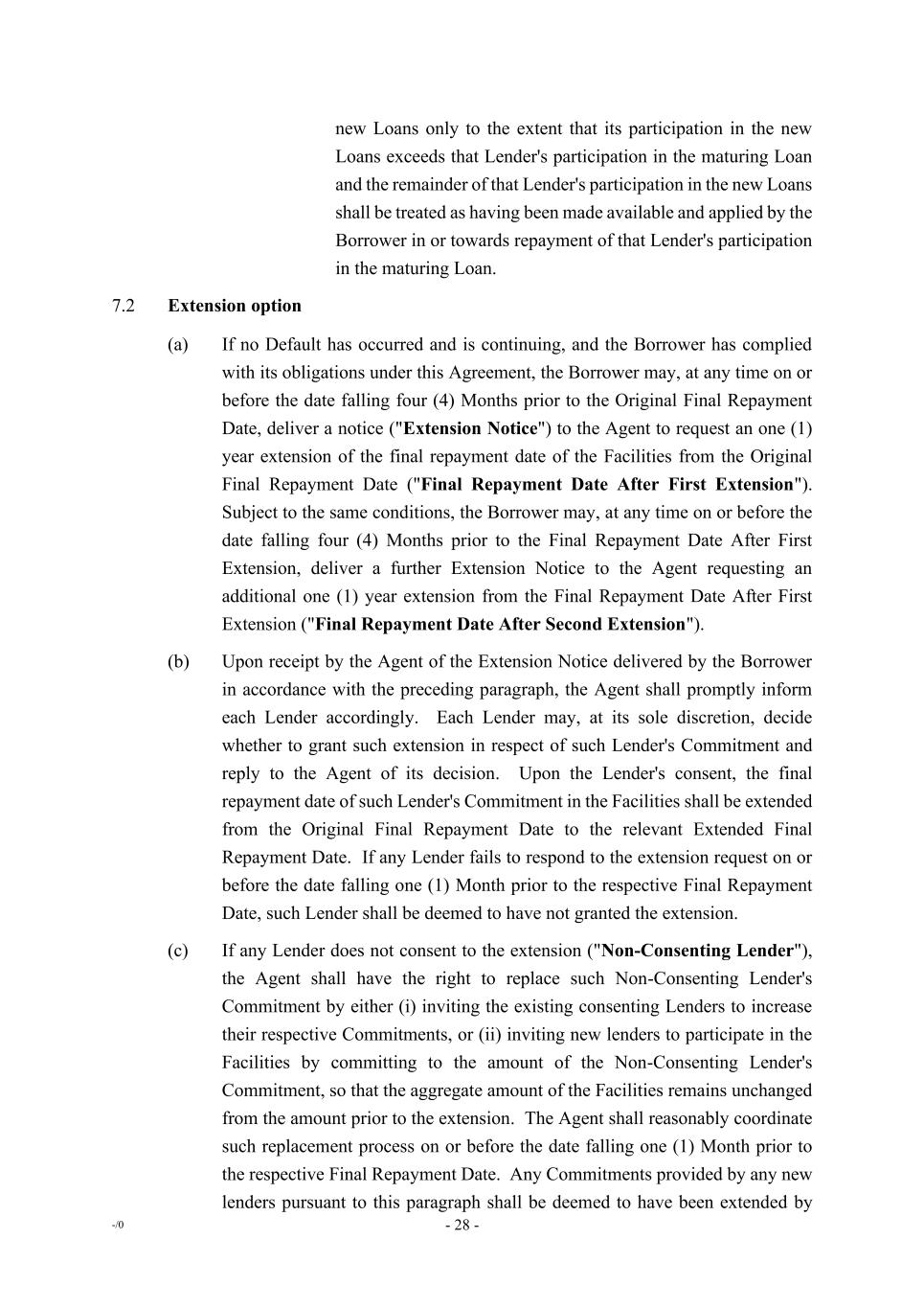 -/0 - 28 - new Loans only to the extent that its participation in the new Loans exceeds that Lender's participation in the maturing Loan and the remainder of that Lender's participation in the new Loans shall be treated as having been made available and applied by the Borrower in or towards repayment of that Lender's participation in the maturing Loan. 7.2 Extension option (a) If no Default has occurred and is continuing, and the Borrower has complied with its obligations under this Agreement, the Borrower may, at any time on or before the date falling four (4) Months prior to the Original Final Repayment Date, deliver a notice ("Extension Notice") to the Agent to request an one (1) year extension of the final repayment date of the Facilities from the Original Final Repayment Date ("Final Repayment Date After First Extension"). Subject to the same conditions, the Borrower may, at any time on or before the date falling four (4) Months prior to the Final Repayment Date After First Extension, deliver a further Extension Notice to the Agent requesting an additional one (1) year extension from the Final Repayment Date After First Extension ("Final Repayment Date After Second Extension"). (b) Upon receipt by the Agent of the Extension Notice delivered by the Borrower in accordance with the preceding paragraph, the Agent shall promptly inform each Lender accordingly. Each Lender may, at its sole discretion, decide whether to grant such extension in respect of such Lender's Commitment and reply to the Agent of its decision. Upon the Lender's consent, the final repayment date of such Lender's Commitment in the Facilities shall be extended from the Original Final Repayment Date to the relevant Extended Final Repayment Date. If any Lender fails to respond to the extension request on or before the date falling one (1) Month prior to the respective Final Repayment Date, such Lender shall be deemed to have not granted the extension. (c) If any Lender does not consent to the extension ("Non-Consenting Lender"), the Agent shall have the right to replace such Non-Consenting Lender's Commitment by either (i) inviting the existing consenting Lenders to increase their respective Commitments, or (ii) inviting new lenders to participate in the Facilities by committing to the amount of the Non-Consenting Lender's Commitment, so that the aggregate amount of the Facilities remains unchanged from the amount prior to the extension. The Agent shall reasonably coordinate such replacement process on or before the date falling one (1) Month prior to the respective Final Repayment Date. Any Commitments provided by any new lenders pursuant to this paragraph shall be deemed to have been extended by