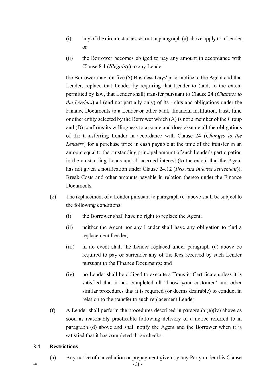 -/0 - 31 - (i) any of the circumstances set out in paragraph (a) above apply to a Lender; or (ii) the Borrower becomes obliged to pay any amount in accordance with Clause 8.1 (Illegality) to any Lender, the Borrower may, on five (5) Business Days' prior notice to the Agent and that Lender, replace that Lender by requiring that Lender to (and, to the extent permitted by law, that Lender shall) transfer pursuant to Clause 24 (Changes to the Lenders) all (and not partially only) of its rights and obligations under the Finance Documents to a Lender or other bank, financial institution, trust, fund or other entity selected by the Borrower which (A) is not a member of the Group and (B) confirms its willingness to assume and does assume all the obligations of the transferring Lender in accordance with Clause 24 (Changes to the Lenders) for a purchase price in cash payable at the time of the transfer in an amount equal to the outstanding principal amount of such Lender's participation in the outstanding Loans and all accrued interest (to the extent that the Agent has not given a notification under Clause 24.12 (Pro rata interest settlement)), Break Costs and other amounts payable in relation thereto under the Finance Documents. (e) The replacement of a Lender pursuant to paragraph (d) above shall be subject to the following conditions: (i) the Borrower shall have no right to replace the Agent; (ii) neither the Agent nor any Lender shall have any obligation to find a replacement Lender; (iii) in no event shall the Lender replaced under paragraph (d) above be required to pay or surrender any of the fees received by such Lender pursuant to the Finance Documents; and (iv) no Lender shall be obliged to execute a Transfer Certificate unless it is satisfied that it has completed all "know your customer" and other similar procedures that it is required (or deems desirable) to conduct in relation to the transfer to such replacement Lender. (f) A Lender shall perform the procedures described in paragraph (e)(iv) above as soon as reasonably practicable following delivery of a notice referred to in paragraph (d) above and shall notify the Agent and the Borrower when it is satisfied that it has completed those checks. 8.4 Restrictions (a) Any notice of cancellation or prepayment given by any Party under this Clause