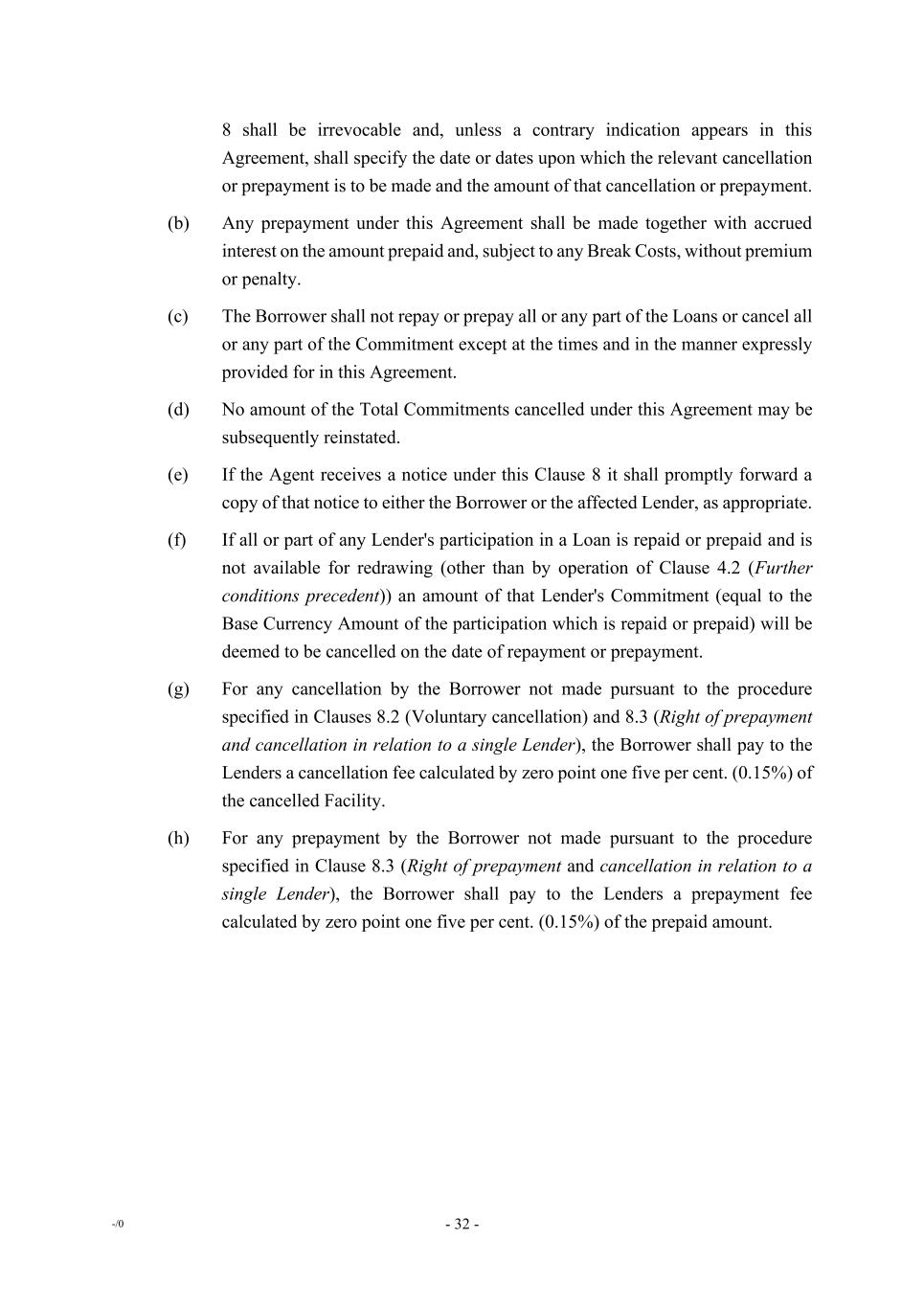 -/0 - 32 - 8 shall be irrevocable and, unless a contrary indication appears in this Agreement, shall specify the date or dates upon which the relevant cancellation or prepayment is to be made and the amount of that cancellation or prepayment. (b) Any prepayment under this Agreement shall be made together with accrued interest on the amount prepaid and, subject to any Break Costs, without premium or penalty. (c) The Borrower shall not repay or prepay all or any part of the Loans or cancel all or any part of the Commitment except at the times and in the manner expressly provided for in this Agreement. (d) No amount of the Total Commitments cancelled under this Agreement may be subsequently reinstated. (e) If the Agent receives a notice under this Clause 8 it shall promptly forward a copy of that notice to either the Borrower or the affected Lender, as appropriate. (f) If all or part of any Lender's participation in a Loan is repaid or prepaid and is not available for redrawing (other than by operation of Clause 4.2 (Further conditions precedent)) an amount of that Lender's Commitment (equal to the Base Currency Amount of the participation which is repaid or prepaid) will be deemed to be cancelled on the date of repayment or prepayment. (g) For any cancellation by the Borrower not made pursuant to the procedure specified in Clauses 8.2 (Voluntary cancellation) and 8.3 (Right of prepayment and cancellation in relation to a single Lender), the Borrower shall pay to the Lenders a cancellation fee calculated by zero point one five per cent. (0.15%) of the cancelled Facility. (h) For any prepayment by the Borrower not made pursuant to the procedure specified in Clause 8.3 (Right of prepayment and cancellation in relation to a single Lender), the Borrower shall pay to the Lenders a prepayment fee calculated by zero point one five per cent. (0.15%) of the prepaid amount.