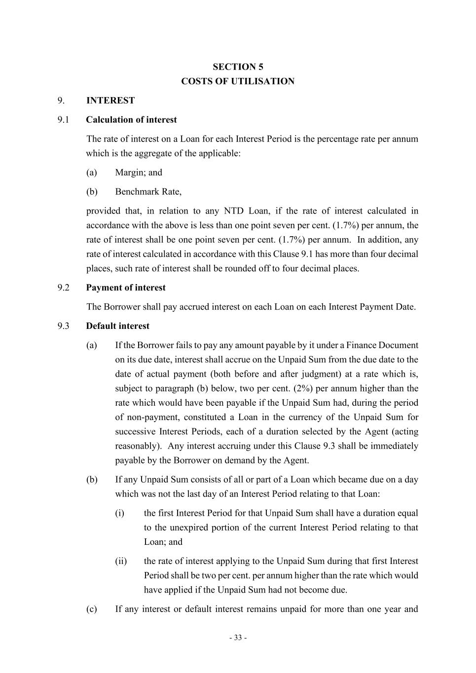 - 33 - SECTION 5 COSTS OF UTILISATION 9. INTEREST 9.1 Calculation of interest The rate of interest on a Loan for each Interest Period is the percentage rate per annum which is the aggregate of the applicable: (a) Margin; and (b) Benchmark Rate, provided that, in relation to any NTD Loan, if the rate of interest calculated in accordance with the above is less than one point seven per cent. (1.7%) per annum, the rate of interest shall be one point seven per cent. (1.7%) per annum. In addition, any rate of interest calculated in accordance with this Clause 9.1 has more than four decimal places, such rate of interest shall be rounded off to four decimal places. 9.2 Payment of interest The Borrower shall pay accrued interest on each Loan on each Interest Payment Date. 9.3 Default interest (a) If the Borrower fails to pay any amount payable by it under a Finance Document on its due date, interest shall accrue on the Unpaid Sum from the due date to the date of actual payment (both before and after judgment) at a rate which is, subject to paragraph (b) below, two per cent. (2%) per annum higher than the rate which would have been payable if the Unpaid Sum had, during the period of non-payment, constituted a Loan in the currency of the Unpaid Sum for successive Interest Periods, each of a duration selected by the Agent (acting reasonably). Any interest accruing under this Clause 9.3 shall be immediately payable by the Borrower on demand by the Agent. (b) If any Unpaid Sum consists of all or part of a Loan which became due on a day which was not the last day of an Interest Period relating to that Loan: (i) the first Interest Period for that Unpaid Sum shall have a duration equal to the unexpired portion of the current Interest Period relating to that Loan; and (ii) the rate of interest applying to the Unpaid Sum during that first Interest Period shall be two per cent. per annum higher than the rate which would have applied if the Unpaid Sum had not become due. (c) If any interest or default interest remains unpaid for more than one year and