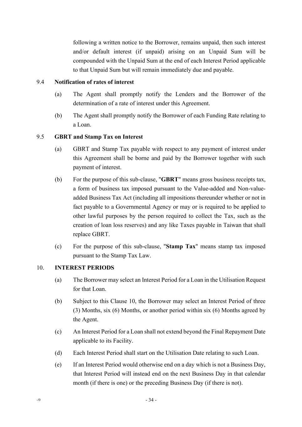 -/0 - 34 - following a written notice to the Borrower, remains unpaid, then such interest and/or default interest (if unpaid) arising on an Unpaid Sum will be compounded with the Unpaid Sum at the end of each Interest Period applicable to that Unpaid Sum but will remain immediately due and payable. 9.4 Notification of rates of interest (a) The Agent shall promptly notify the Lenders and the Borrower of the determination of a rate of interest under this Agreement. (b) The Agent shall promptly notify the Borrower of each Funding Rate relating to a Loan. 9.5 GBRT and Stamp Tax on Interest (a) GBRT and Stamp Tax payable with respect to any payment of interest under this Agreement shall be borne and paid by the Borrower together with such payment of interest. (b) For the purpose of this sub-clause, "GBRT" means gross business receipts tax, a form of business tax imposed pursuant to the Value-added and Non-value- added Business Tax Act (including all impositions thereunder whether or not in fact payable to a Governmental Agency or may or is required to be applied to other lawful purposes by the person required to collect the Tax, such as the creation of loan loss reserves) and any like Taxes payable in Taiwan that shall replace GBRT. (c) For the purpose of this sub-clause, "Stamp Tax" means stamp tax imposed pursuant to the Stamp Tax Law. 10. INTEREST PERIODS (a) The Borrower may select an Interest Period for a Loan in the Utilisation Request for that Loan. (b) Subject to this Clause 10, the Borrower may select an Interest Period of three (3) Months, six (6) Months, or another period within six (6) Months agreed by the Agent. (c) An Interest Period for a Loan shall not extend beyond the Final Repayment Date applicable to its Facility. (d) Each Interest Period shall start on the Utilisation Date relating to such Loan. (e) If an Interest Period would otherwise end on a day which is not a Business Day, that Interest Period will instead end on the next Business Day in that calendar month (if there is one) or the preceding Business Day (if there is not).