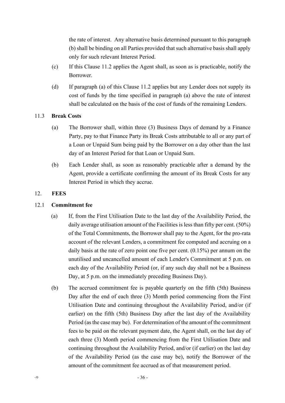 -/0 - 36 - the rate of interest. Any alternative basis determined pursuant to this paragraph (b) shall be binding on all Parties provided that such alternative basis shall apply only for such relevant Interest Period. (c) If this Clause 11.2 applies the Agent shall, as soon as is practicable, notify the Borrower. (d) If paragraph (a) of this Clause 11.2 applies but any Lender does not supply its cost of funds by the time specified in paragraph (a) above the rate of interest shall be calculated on the basis of the cost of funds of the remaining Lenders. 11.3 Break Costs (a) The Borrower shall, within three (3) Business Days of demand by a Finance Party, pay to that Finance Party its Break Costs attributable to all or any part of a Loan or Unpaid Sum being paid by the Borrower on a day other than the last day of an Interest Period for that Loan or Unpaid Sum. (b) Each Lender shall, as soon as reasonably practicable after a demand by the Agent, provide a certificate confirming the amount of its Break Costs for any Interest Period in which they accrue. 12. FEES 12.1 Commitment fee (a) If, from the First Utilisation Date to the last day of the Availability Period, the daily average utilisation amount of the Facilities is less than fifty per cent. (50%) of the Total Commitments, the Borrower shall pay to the Agent, for the pro-rata account of the relevant Lenders, a commitment fee computed and accruing on a daily basis at the rate of zero point one five per cent. (0.15%) per annum on the unutilised and uncancelled amount of each Lender's Commitment at 5 p.m. on each day of the Availability Period (or, if any such day shall not be a Business Day, at 5 p.m. on the immediately preceding Business Day). (b) The accrued commitment fee is payable quarterly on the fifth (5th) Business Day after the end of each three (3) Month period commencing from the First Utilisation Date and continuing throughout the Availability Period, and/or (if earlier) on the fifth (5th) Business Day after the last day of the Availability Period (as the case may be). For determination of the amount of the commitment fees to be paid on the relevant payment date, the Agent shall, on the last day of each three (3) Month period commencing from the First Utilisation Date and continuing throughout the Availability Period, and/or (if earlier) on the last day of the Availability Period (as the case may be), notify the Borrower of the amount of the commitment fee accrued as of that measurement period.