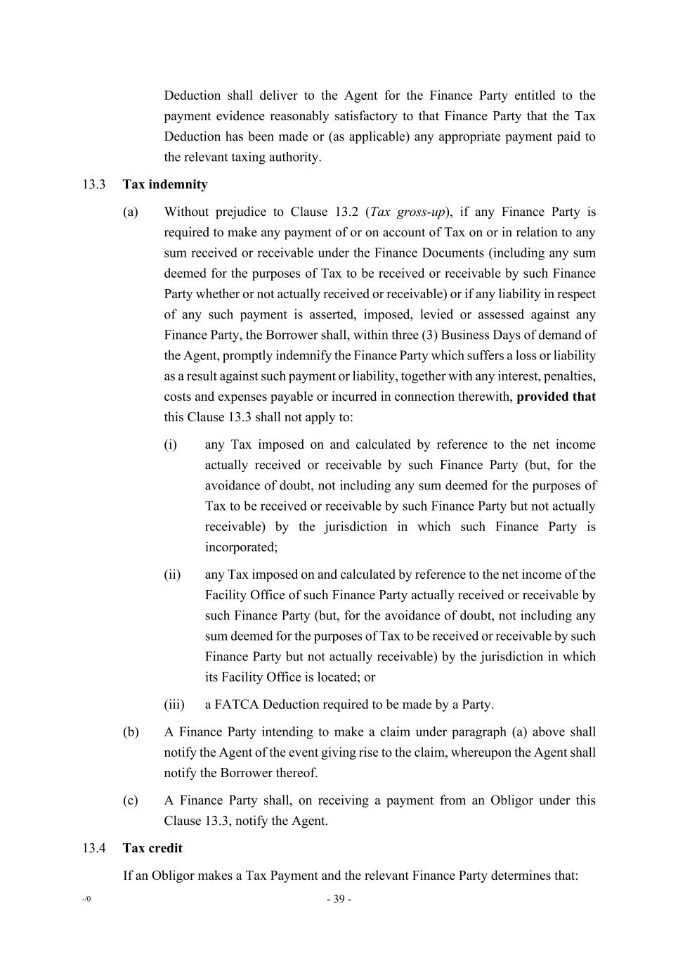 -/0 - 39 - Deduction shall deliver to the Agent for the Finance Party entitled to the payment evidence reasonably satisfactory to that Finance Party that the Tax Deduction has been made or (as applicable) any appropriate payment paid to the relevant taxing authority. 13.3 Tax indemnity (a) Without prejudice to Clause 13.2 (Tax gross-up), if any Finance Party is required to make any payment of or on account of Tax on or in relation to any sum received or receivable under the Finance Documents (including any sum deemed for the purposes of Tax to be received or receivable by such Finance Party whether or not actually received or receivable) or if any liability in respect of any such payment is asserted, imposed, levied or assessed against any Finance Party, the Borrower shall, within three (3) Business Days of demand of the Agent, promptly indemnify the Finance Party which suffers a loss or liability as a result against such payment or liability, together with any interest, penalties, costs and expenses payable or incurred in connection therewith, provided that this Clause 13.3 shall not apply to: (i) any Tax imposed on and calculated by reference to the net income actually received or receivable by such Finance Party (but, for the avoidance of doubt, not including any sum deemed for the purposes of Tax to be received or receivable by such Finance Party but not actually receivable) by the jurisdiction in which such Finance Party is incorporated; (ii) any Tax imposed on and calculated by reference to the net income of the Facility Office of such Finance Party actually received or receivable by such Finance Party (but, for the avoidance of doubt, not including any sum deemed for the purposes of Tax to be received or receivable by such Finance Party but not actually receivable) by the jurisdiction in which its Facility Office is located; or (iii) a FATCA Deduction required to be made by a Party. (b) A Finance Party intending to make a claim under paragraph (a) above shall notify the Agent of the event giving rise to the claim, whereupon the Agent shall notify the Borrower thereof. (c) A Finance Party shall, on receiving a payment from an Obligor under this Clause 13.3, notify the Agent. 13.4 Tax credit If an Obligor makes a Tax Payment and the relevant Finance Party determines that: