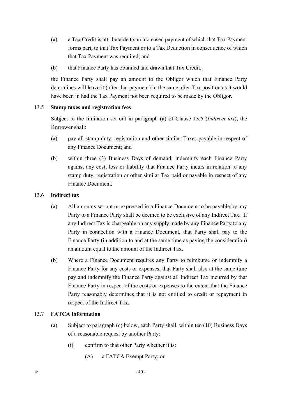 -/0 - 40 - (a) a Tax Credit is attributable to an increased payment of which that Tax Payment forms part, to that Tax Payment or to a Tax Deduction in consequence of which that Tax Payment was required; and (b) that Finance Party has obtained and drawn that Tax Credit, the Finance Party shall pay an amount to the Obligor which that Finance Party determines will leave it (after that payment) in the same after-Tax position as it would have been in had the Tax Payment not been required to be made by the Obligor. 13.5 Stamp taxes and registration fees Subject to the limitation set out in paragraph (a) of Clause 13.6 (Indirect tax), the Borrower shall: (a) pay all stamp duty, registration and other similar Taxes payable in respect of any Finance Document; and (b) within three (3) Business Days of demand, indemnify each Finance Party against any cost, loss or liability that Finance Party incurs in relation to any stamp duty, registration or other similar Tax paid or payable in respect of any Finance Document. 13.6 Indirect tax (a) All amounts set out or expressed in a Finance Document to be payable by any Party to a Finance Party shall be deemed to be exclusive of any Indirect Tax. If any Indirect Tax is chargeable on any supply made by any Finance Party to any Party in connection with a Finance Document, that Party shall pay to the Finance Party (in addition to and at the same time as paying the consideration) an amount equal to the amount of the Indirect Tax. (b) Where a Finance Document requires any Party to reimburse or indemnify a Finance Party for any costs or expenses, that Party shall also at the same time pay and indemnify the Finance Party against all Indirect Tax incurred by that Finance Party in respect of the costs or expenses to the extent that the Finance Party reasonably determines that it is not entitled to credit or repayment in respect of the Indirect Tax. 13.7 FATCA information (a) Subject to paragraph (c) below, each Party shall, within ten (10) Business Days of a reasonable request by another Party: (i) confirm to that other Party whether it is: (A) a FATCA Exempt Party; or