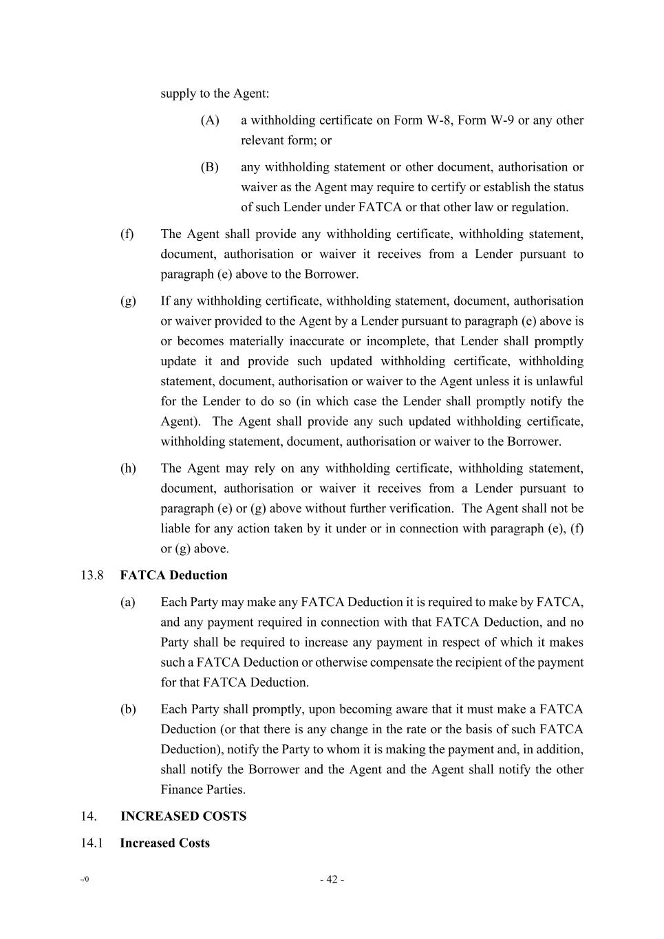 -/0 - 42 - supply to the Agent: (A) a withholding certificate on Form W-8, Form W-9 or any other relevant form; or (B) any withholding statement or other document, authorisation or waiver as the Agent may require to certify or establish the status of such Lender under FATCA or that other law or regulation. (f) The Agent shall provide any withholding certificate, withholding statement, document, authorisation or waiver it receives from a Lender pursuant to paragraph (e) above to the Borrower. (g) If any withholding certificate, withholding statement, document, authorisation or waiver provided to the Agent by a Lender pursuant to paragraph (e) above is or becomes materially inaccurate or incomplete, that Lender shall promptly update it and provide such updated withholding certificate, withholding statement, document, authorisation or waiver to the Agent unless it is unlawful for the Lender to do so (in which case the Lender shall promptly notify the Agent). The Agent shall provide any such updated withholding certificate, withholding statement, document, authorisation or waiver to the Borrower. (h) The Agent may rely on any withholding certificate, withholding statement, document, authorisation or waiver it receives from a Lender pursuant to paragraph (e) or (g) above without further verification. The Agent shall not be liable for any action taken by it under or in connection with paragraph (e), (f) or (g) above. 13.8 FATCA Deduction (a) Each Party may make any FATCA Deduction it is required to make by FATCA, and any payment required in connection with that FATCA Deduction, and no Party shall be required to increase any payment in respect of which it makes such a FATCA Deduction or otherwise compensate the recipient of the payment for that FATCA Deduction. (b) Each Party shall promptly, upon becoming aware that it must make a FATCA Deduction (or that there is any change in the rate or the basis of such FATCA Deduction), notify the Party to whom it is making the payment and, in addition, shall notify the Borrower and the Agent and the Agent shall notify the other Finance Parties. 14. INCREASED COSTS 14.1 Increased Costs