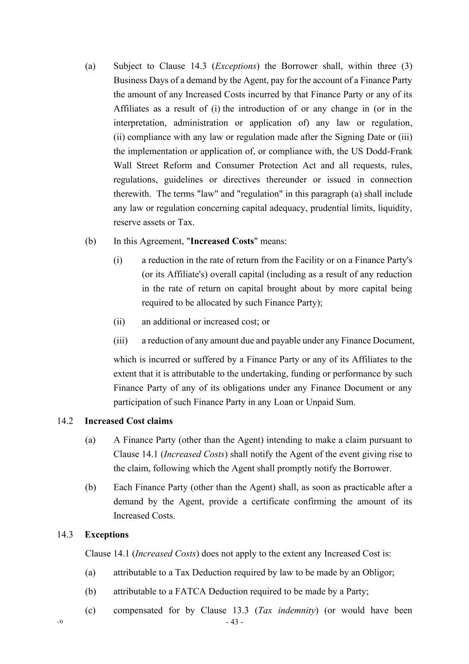 -/0 - 43 - (a) Subject to Clause 14.3 (Exceptions) the Borrower shall, within three (3) Business Days of a demand by the Agent, pay for the account of a Finance Party the amount of any Increased Costs incurred by that Finance Party or any of its Affiliates as a result of (i) the introduction of or any change in (or in the interpretation, administration or application of) any law or regulation, (ii) compliance with any law or regulation made after the Signing Date or (iii) the implementation or application of, or compliance with, the US Dodd-Frank Wall Street Reform and Consumer Protection Act and all requests, rules, regulations, guidelines or directives thereunder or issued in connection therewith. The terms "law" and "regulation" in this paragraph (a) shall include any law or regulation concerning capital adequacy, prudential limits, liquidity, reserve assets or Tax. (b) In this Agreement, "Increased Costs" means: (i) a reduction in the rate of return from the Facility or on a Finance Party's (or its Affiliate's) overall capital (including as a result of any reduction in the rate of return on capital brought about by more capital being required to be allocated by such Finance Party); (ii) an additional or increased cost; or (iii) a reduction of any amount due and payable under any Finance Document, which is incurred or suffered by a Finance Party or any of its Affiliates to the extent that it is attributable to the undertaking, funding or performance by such Finance Party of any of its obligations under any Finance Document or any participation of such Finance Party in any Loan or Unpaid Sum. 14.2 Increased Cost claims (a) A Finance Party (other than the Agent) intending to make a claim pursuant to Clause 14.1 (Increased Costs) shall notify the Agent of the event giving rise to the claim, following which the Agent shall promptly notify the Borrower. (b) Each Finance Party (other than the Agent) shall, as soon as practicable after a demand by the Agent, provide a certificate confirming the amount of its Increased Costs. 14.3 Exceptions Clause 14.1 (Increased Costs) does not apply to the extent any Increased Cost is: (a) attributable to a Tax Deduction required by law to be made by an Obligor; (b) attributable to a FATCA Deduction required to be made by a Party; (c) compensated for by Clause 13.3 (Tax indemnity) (or would have been