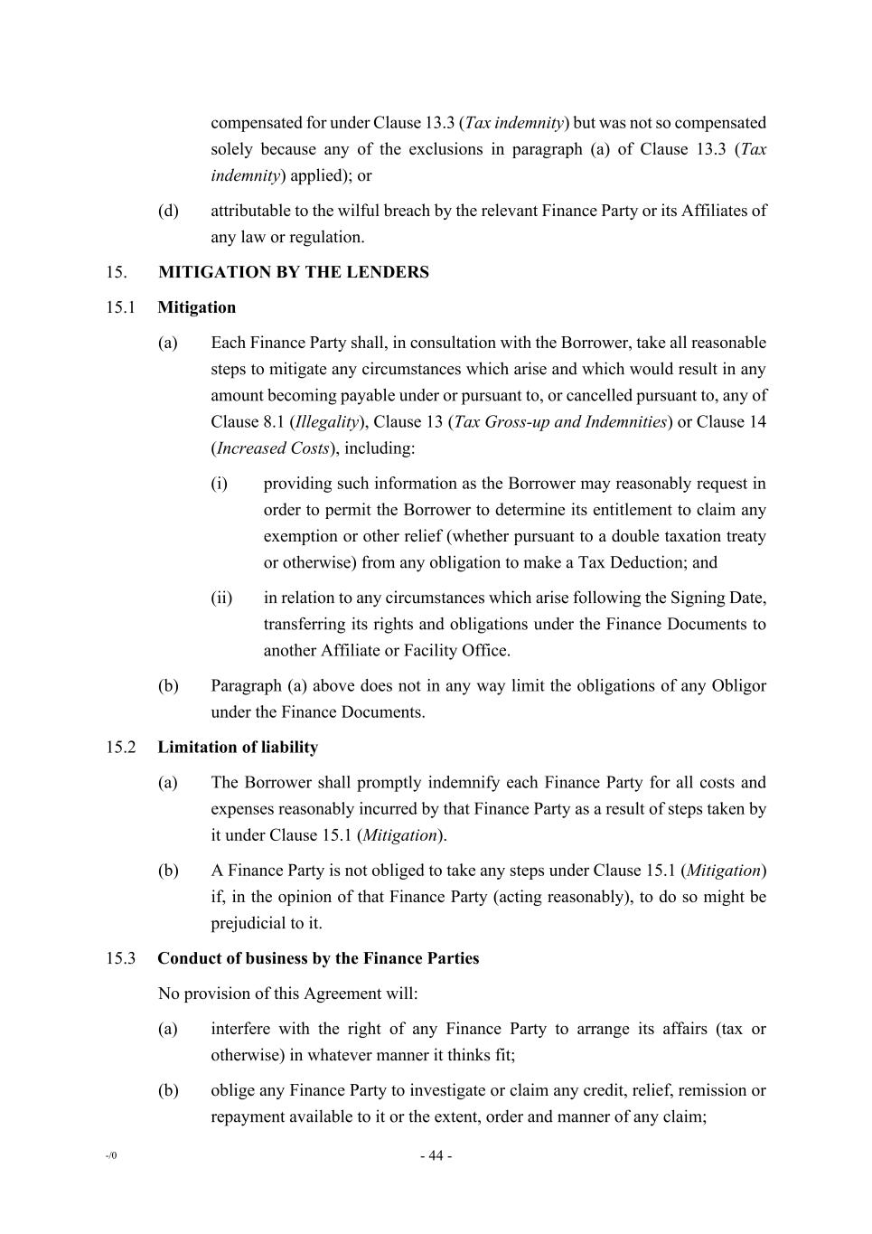 -/0 - 44 - compensated for under Clause 13.3 (Tax indemnity) but was not so compensated solely because any of the exclusions in paragraph (a) of Clause 13.3 (Tax indemnity) applied); or (d) attributable to the wilful breach by the relevant Finance Party or its Affiliates of any law or regulation. 15. MITIGATION BY THE LENDERS 15.1 Mitigation (a) Each Finance Party shall, in consultation with the Borrower, take all reasonable steps to mitigate any circumstances which arise and which would result in any amount becoming payable under or pursuant to, or cancelled pursuant to, any of Clause 8.1 (Illegality), Clause 13 (Tax Gross-up and Indemnities) or Clause 14 (Increased Costs), including: (i) providing such information as the Borrower may reasonably request in order to permit the Borrower to determine its entitlement to claim any exemption or other relief (whether pursuant to a double taxation treaty or otherwise) from any obligation to make a Tax Deduction; and (ii) in relation to any circumstances which arise following the Signing Date, transferring its rights and obligations under the Finance Documents to another Affiliate or Facility Office. (b) Paragraph (a) above does not in any way limit the obligations of any Obligor under the Finance Documents. 15.2 Limitation of liability (a) The Borrower shall promptly indemnify each Finance Party for all costs and expenses reasonably incurred by that Finance Party as a result of steps taken by it under Clause 15.1 (Mitigation). (b) A Finance Party is not obliged to take any steps under Clause 15.1 (Mitigation) if, in the opinion of that Finance Party (acting reasonably), to do so might be prejudicial to it. 15.3 Conduct of business by the Finance Parties No provision of this Agreement will: (a) interfere with the right of any Finance Party to arrange its affairs (tax or otherwise) in whatever manner it thinks fit; (b) oblige any Finance Party to investigate or claim any credit, relief, remission or repayment available to it or the extent, order and manner of any claim;