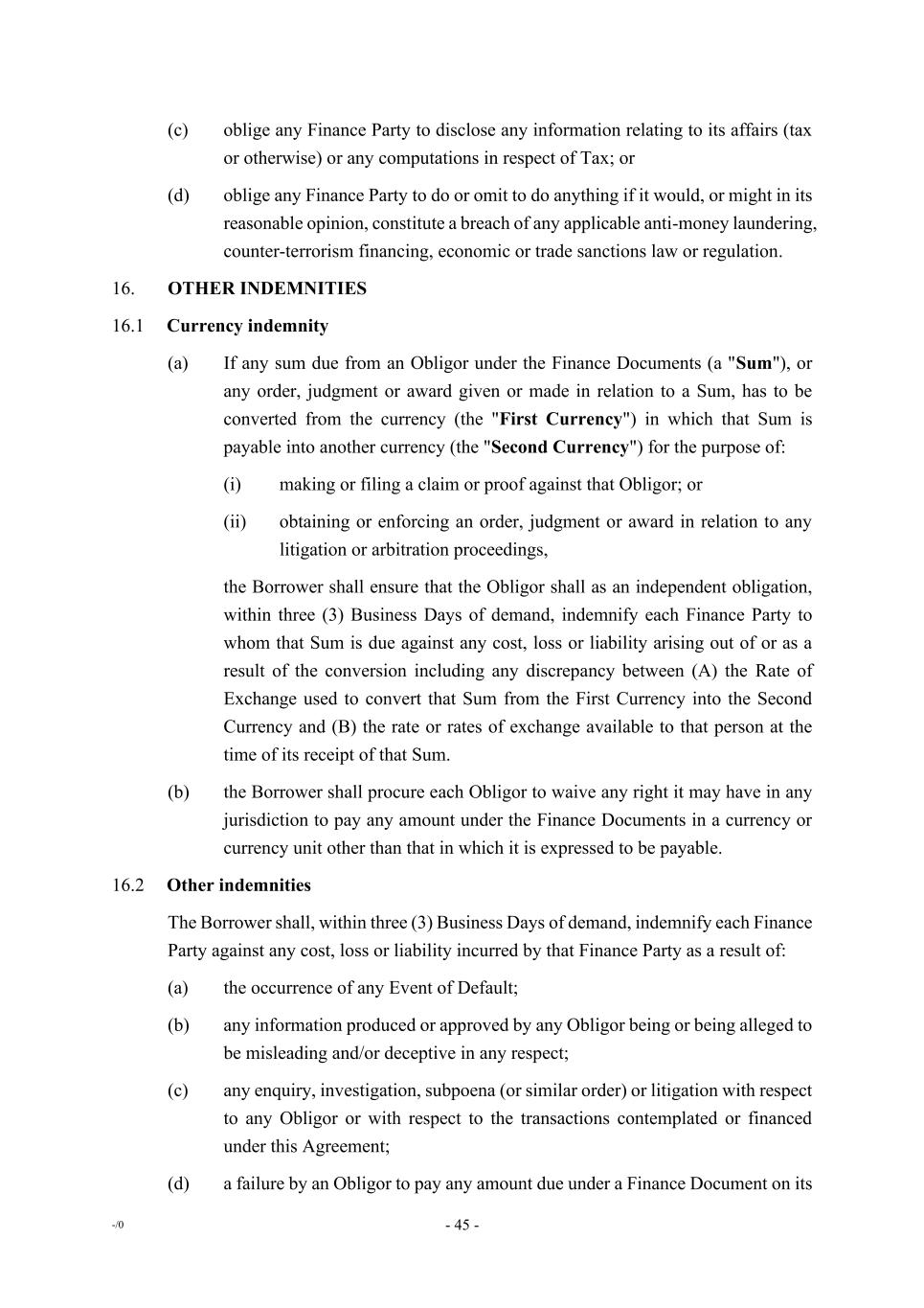 -/0 - 45 - (c) oblige any Finance Party to disclose any information relating to its affairs (tax or otherwise) or any computations in respect of Tax; or (d) oblige any Finance Party to do or omit to do anything if it would, or might in its reasonable opinion, constitute a breach of any applicable anti-money laundering, counter-terrorism financing, economic or trade sanctions law or regulation. 16. OTHER INDEMNITIES 16.1 Currency indemnity (a) If any sum due from an Obligor under the Finance Documents (a "Sum"), or any order, judgment or award given or made in relation to a Sum, has to be converted from the currency (the "First Currency") in which that Sum is payable into another currency (the "Second Currency") for the purpose of: (i) making or filing a claim or proof against that Obligor; or (ii) obtaining or enforcing an order, judgment or award in relation to any litigation or arbitration proceedings, the Borrower shall ensure that the Obligor shall as an independent obligation, within three (3) Business Days of demand, indemnify each Finance Party to whom that Sum is due against any cost, loss or liability arising out of or as a result of the conversion including any discrepancy between (A) the Rate of Exchange used to convert that Sum from the First Currency into the Second Currency and (B) the rate or rates of exchange available to that person at the time of its receipt of that Sum. (b) the Borrower shall procure each Obligor to waive any right it may have in any jurisdiction to pay any amount under the Finance Documents in a currency or currency unit other than that in which it is expressed to be payable. 16.2 Other indemnities The Borrower shall, within three (3) Business Days of demand, indemnify each Finance Party against any cost, loss or liability incurred by that Finance Party as a result of: (a) the occurrence of any Event of Default; (b) any information produced or approved by any Obligor being or being alleged to be misleading and/or deceptive in any respect; (c) any enquiry, investigation, subpoena (or similar order) or litigation with respect to any Obligor or with respect to the transactions contemplated or financed under this Agreement; (d) a failure by an Obligor to pay any amount due under a Finance Document on its