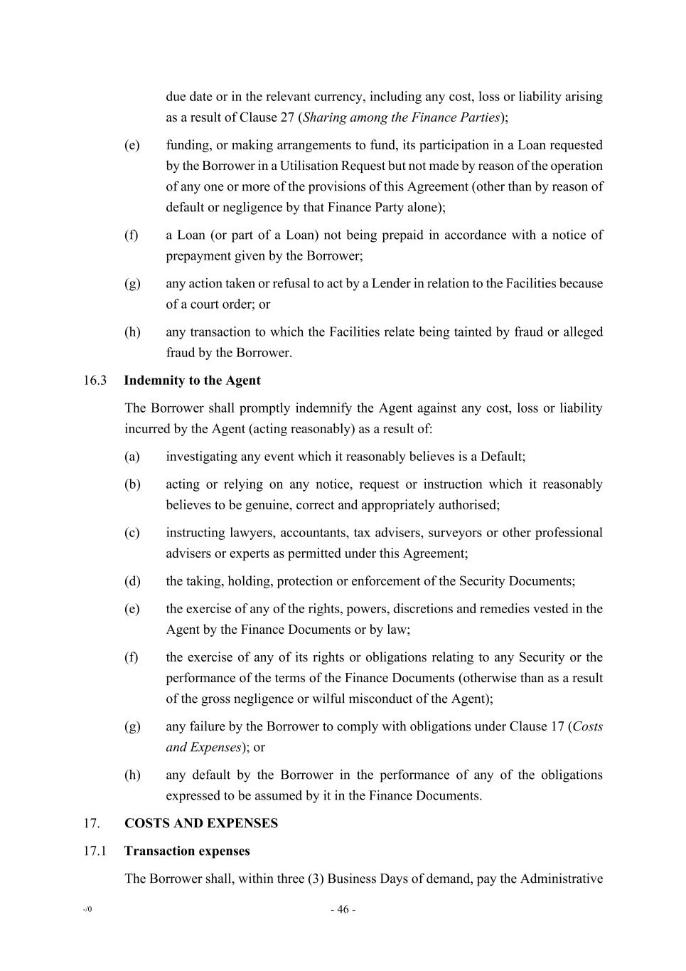 -/0 - 46 - due date or in the relevant currency, including any cost, loss or liability arising as a result of Clause 27 (Sharing among the Finance Parties); (e) funding, or making arrangements to fund, its participation in a Loan requested by the Borrower in a Utilisation Request but not made by reason of the operation of any one or more of the provisions of this Agreement (other than by reason of default or negligence by that Finance Party alone); (f) a Loan (or part of a Loan) not being prepaid in accordance with a notice of prepayment given by the Borrower; (g) any action taken or refusal to act by a Lender in relation to the Facilities because of a court order; or (h) any transaction to which the Facilities relate being tainted by fraud or alleged fraud by the Borrower. 16.3 Indemnity to the Agent The Borrower shall promptly indemnify the Agent against any cost, loss or liability incurred by the Agent (acting reasonably) as a result of: (a) investigating any event which it reasonably believes is a Default; (b) acting or relying on any notice, request or instruction which it reasonably believes to be genuine, correct and appropriately authorised; (c) instructing lawyers, accountants, tax advisers, surveyors or other professional advisers or experts as permitted under this Agreement; (d) the taking, holding, protection or enforcement of the Security Documents; (e) the exercise of any of the rights, powers, discretions and remedies vested in the Agent by the Finance Documents or by law; (f) the exercise of any of its rights or obligations relating to any Security or the performance of the terms of the Finance Documents (otherwise than as a result of the gross negligence or wilful misconduct of the Agent); (g) any failure by the Borrower to comply with obligations under Clause 17 (Costs and Expenses); or (h) any default by the Borrower in the performance of any of the obligations expressed to be assumed by it in the Finance Documents. 17. COSTS AND EXPENSES 17.1 Transaction expenses The Borrower shall, within three (3) Business Days of demand, pay the Administrative