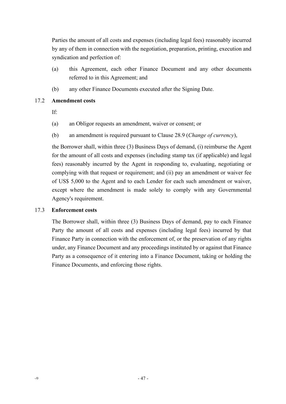 -/0 - 47 - Parties the amount of all costs and expenses (including legal fees) reasonably incurred by any of them in connection with the negotiation, preparation, printing, execution and syndication and perfection of: (a) this Agreement, each other Finance Document and any other documents referred to in this Agreement; and (b) any other Finance Documents executed after the Signing Date. 17.2 Amendment costs If: (a) an Obligor requests an amendment, waiver or consent; or (b) an amendment is required pursuant to Clause 28.9 (Change of currency), the Borrower shall, within three (3) Business Days of demand, (i) reimburse the Agent for the amount of all costs and expenses (including stamp tax (if applicable) and legal fees) reasonably incurred by the Agent in responding to, evaluating, negotiating or complying with that request or requirement; and (ii) pay an amendment or waiver fee of US$ 5,000 to the Agent and to each Lender for each such amendment or waiver, except where the amendment is made solely to comply with any Governmental Agency's requirement. 17.3 Enforcement costs The Borrower shall, within three (3) Business Days of demand, pay to each Finance Party the amount of all costs and expenses (including legal fees) incurred by that Finance Party in connection with the enforcement of, or the preservation of any rights under, any Finance Document and any proceedings instituted by or against that Finance Party as a consequence of it entering into a Finance Document, taking or holding the Finance Documents, and enforcing those rights.