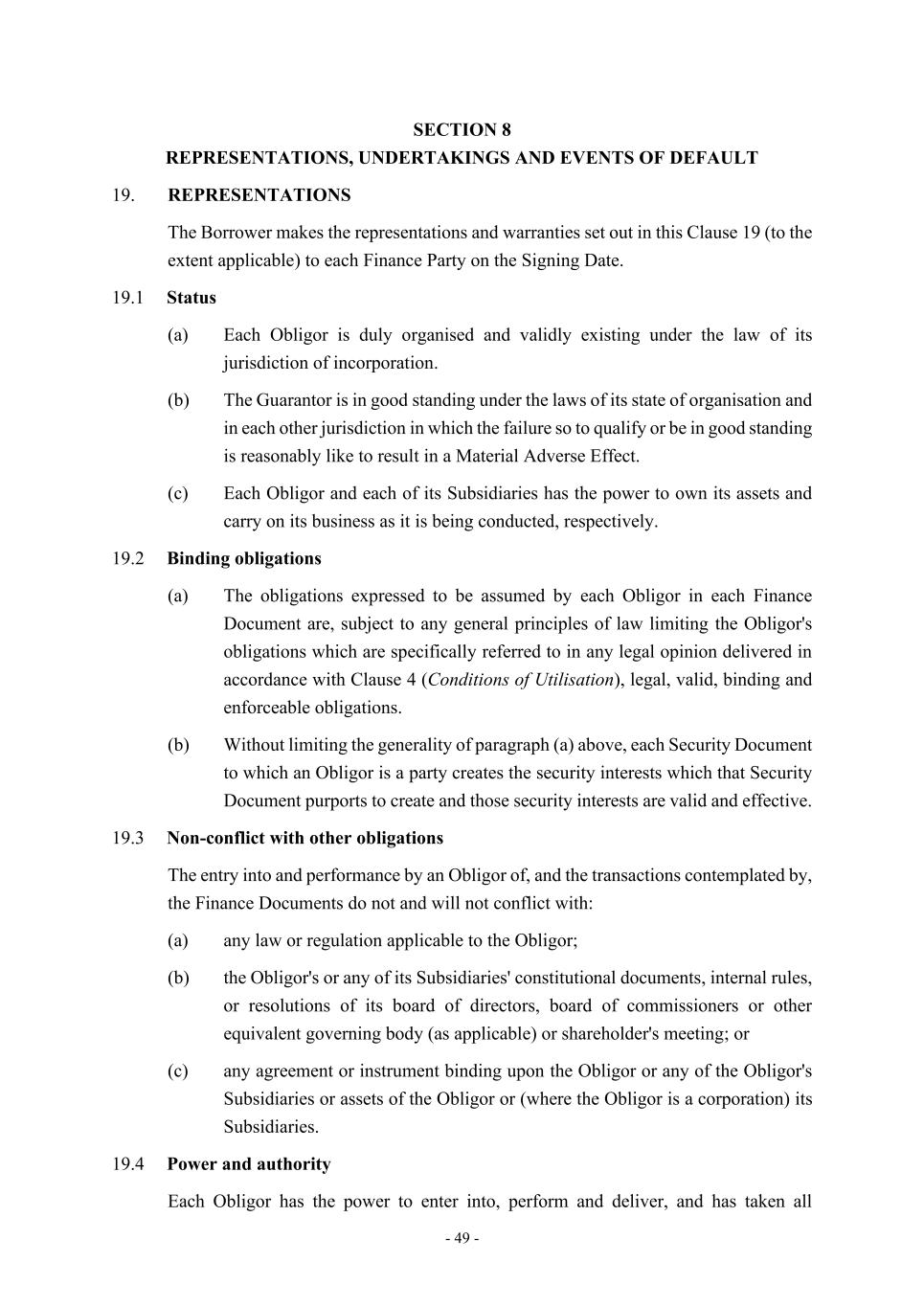 - 49 - SECTION 8 REPRESENTATIONS, UNDERTAKINGS AND EVENTS OF DEFAULT 19. REPRESENTATIONS The Borrower makes the representations and warranties set out in this Clause 19 (to the extent applicable) to each Finance Party on the Signing Date. 19.1 Status (a) Each Obligor is duly organised and validly existing under the law of its jurisdiction of incorporation. (b) The Guarantor is in good standing under the laws of its state of organisation and in each other jurisdiction in which the failure so to qualify or be in good standing is reasonably like to result in a Material Adverse Effect. (c) Each Obligor and each of its Subsidiaries has the power to own its assets and carry on its business as it is being conducted, respectively. 19.2 Binding obligations (a) The obligations expressed to be assumed by each Obligor in each Finance Document are, subject to any general principles of law limiting the Obligor's obligations which are specifically referred to in any legal opinion delivered in accordance with Clause 4 (Conditions of Utilisation), legal, valid, binding and enforceable obligations. (b) Without limiting the generality of paragraph (a) above, each Security Document to which an Obligor is a party creates the security interests which that Security Document purports to create and those security interests are valid and effective. 19.3 Non-conflict with other obligations The entry into and performance by an Obligor of, and the transactions contemplated by, the Finance Documents do not and will not conflict with: (a) any law or regulation applicable to the Obligor; (b) the Obligor's or any of its Subsidiaries' constitutional documents, internal rules, or resolutions of its board of directors, board of commissioners or other equivalent governing body (as applicable) or shareholder's meeting; or (c) any agreement or instrument binding upon the Obligor or any of the Obligor's Subsidiaries or assets of the Obligor or (where the Obligor is a corporation) its Subsidiaries. 19.4 Power and authority Each Obligor has the power to enter into, perform and deliver, and has taken all