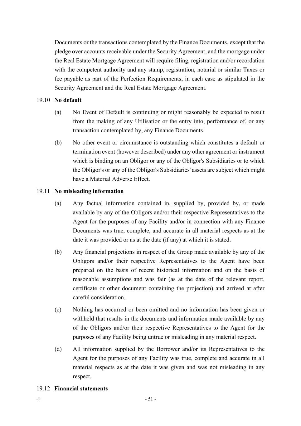 -/0 - 51 - Documents or the transactions contemplated by the Finance Documents, except that the pledge over accounts receivable under the Security Agreement, and the mortgage under the Real Estate Mortgage Agreement will require filing, registration and/or recordation with the competent authority and any stamp, registration, notarial or similar Taxes or fee payable as part of the Perfection Requirements, in each case as stipulated in the Security Agreement and the Real Estate Mortgage Agreement. 19.10 No default (a) No Event of Default is continuing or might reasonably be expected to result from the making of any Utilisation or the entry into, performance of, or any transaction contemplated by, any Finance Documents. (b) No other event or circumstance is outstanding which constitutes a default or termination event (however described) under any other agreement or instrument which is binding on an Obligor or any of the Obligor's Subsidiaries or to which the Obligor's or any of the Obligor's Subsidiaries' assets are subject which might have a Material Adverse Effect. 19.11 No misleading information (a) Any factual information contained in, supplied by, provided by, or made available by any of the Obligors and/or their respective Representatives to the Agent for the purposes of any Facility and/or in connection with any Finance Documents was true, complete, and accurate in all material respects as at the date it was provided or as at the date (if any) at which it is stated. (b) Any financial projections in respect of the Group made available by any of the Obligors and/or their respective Representatives to the Agent have been prepared on the basis of recent historical information and on the basis of reasonable assumptions and was fair (as at the date of the relevant report, certificate or other document containing the projection) and arrived at after careful consideration. (c) Nothing has occurred or been omitted and no information has been given or withheld that results in the documents and information made available by any of the Obligors and/or their respective Representatives to the Agent for the purposes of any Facility being untrue or misleading in any material respect. (d) All information supplied by the Borrower and/or its Representatives to the Agent for the purposes of any Facility was true, complete and accurate in all material respects as at the date it was given and was not misleading in any respect. 19.12 Financial statements