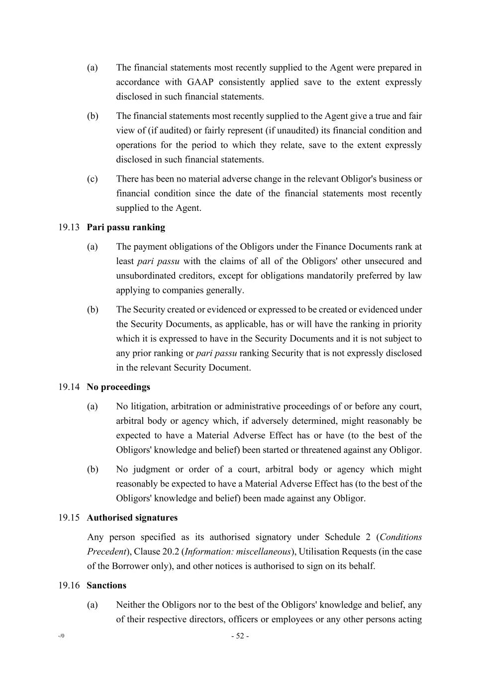 -/0 - 52 - (a) The financial statements most recently supplied to the Agent were prepared in accordance with GAAP consistently applied save to the extent expressly disclosed in such financial statements. (b) The financial statements most recently supplied to the Agent give a true and fair view of (if audited) or fairly represent (if unaudited) its financial condition and operations for the period to which they relate, save to the extent expressly disclosed in such financial statements. (c) There has been no material adverse change in the relevant Obligor's business or financial condition since the date of the financial statements most recently supplied to the Agent. 19.13 Pari passu ranking (a) The payment obligations of the Obligors under the Finance Documents rank at least pari passu with the claims of all of the Obligors' other unsecured and unsubordinated creditors, except for obligations mandatorily preferred by law applying to companies generally. (b) The Security created or evidenced or expressed to be created or evidenced under the Security Documents, as applicable, has or will have the ranking in priority which it is expressed to have in the Security Documents and it is not subject to any prior ranking or pari passu ranking Security that is not expressly disclosed in the relevant Security Document. 19.14 No proceedings (a) No litigation, arbitration or administrative proceedings of or before any court, arbitral body or agency which, if adversely determined, might reasonably be expected to have a Material Adverse Effect has or have (to the best of the Obligors' knowledge and belief) been started or threatened against any Obligor. (b) No judgment or order of a court, arbitral body or agency which might reasonably be expected to have a Material Adverse Effect has (to the best of the Obligors' knowledge and belief) been made against any Obligor. 19.15 Authorised signatures Any person specified as its authorised signatory under Schedule 2 (Conditions Precedent), Clause 20.2 (Information: miscellaneous), Utilisation Requests (in the case of the Borrower only), and other notices is authorised to sign on its behalf. 19.16 Sanctions (a) Neither the Obligors nor to the best of the Obligors' knowledge and belief, any of their respective directors, officers or employees or any other persons acting