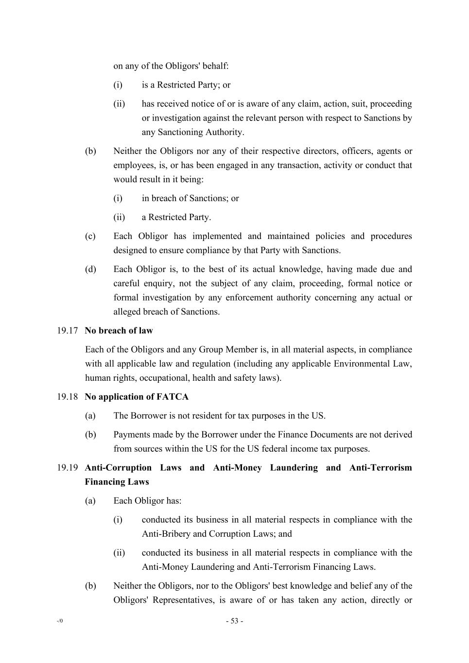 -/0 - 53 - on any of the Obligors' behalf: (i) is a Restricted Party; or (ii) has received notice of or is aware of any claim, action, suit, proceeding or investigation against the relevant person with respect to Sanctions by any Sanctioning Authority. (b) Neither the Obligors nor any of their respective directors, officers, agents or employees, is, or has been engaged in any transaction, activity or conduct that would result in it being: (i) in breach of Sanctions; or (ii) a Restricted Party. (c) Each Obligor has implemented and maintained policies and procedures designed to ensure compliance by that Party with Sanctions. (d) Each Obligor is, to the best of its actual knowledge, having made due and careful enquiry, not the subject of any claim, proceeding, formal notice or formal investigation by any enforcement authority concerning any actual or alleged breach of Sanctions. 19.17 No breach of law Each of the Obligors and any Group Member is, in all material aspects, in compliance with all applicable law and regulation (including any applicable Environmental Law, human rights, occupational, health and safety laws). 19.18 No application of FATCA (a) The Borrower is not resident for tax purposes in the US. (b) Payments made by the Borrower under the Finance Documents are not derived from sources within the US for the US federal income tax purposes. 19.19 Anti-Corruption Laws and Anti-Money Laundering and Anti-Terrorism Financing Laws (a) Each Obligor has: (i) conducted its business in all material respects in compliance with the Anti-Bribery and Corruption Laws; and (ii) conducted its business in all material respects in compliance with the Anti-Money Laundering and Anti-Terrorism Financing Laws. (b) Neither the Obligors, nor to the Obligors' best knowledge and belief any of the Obligors' Representatives, is aware of or has taken any action, directly or