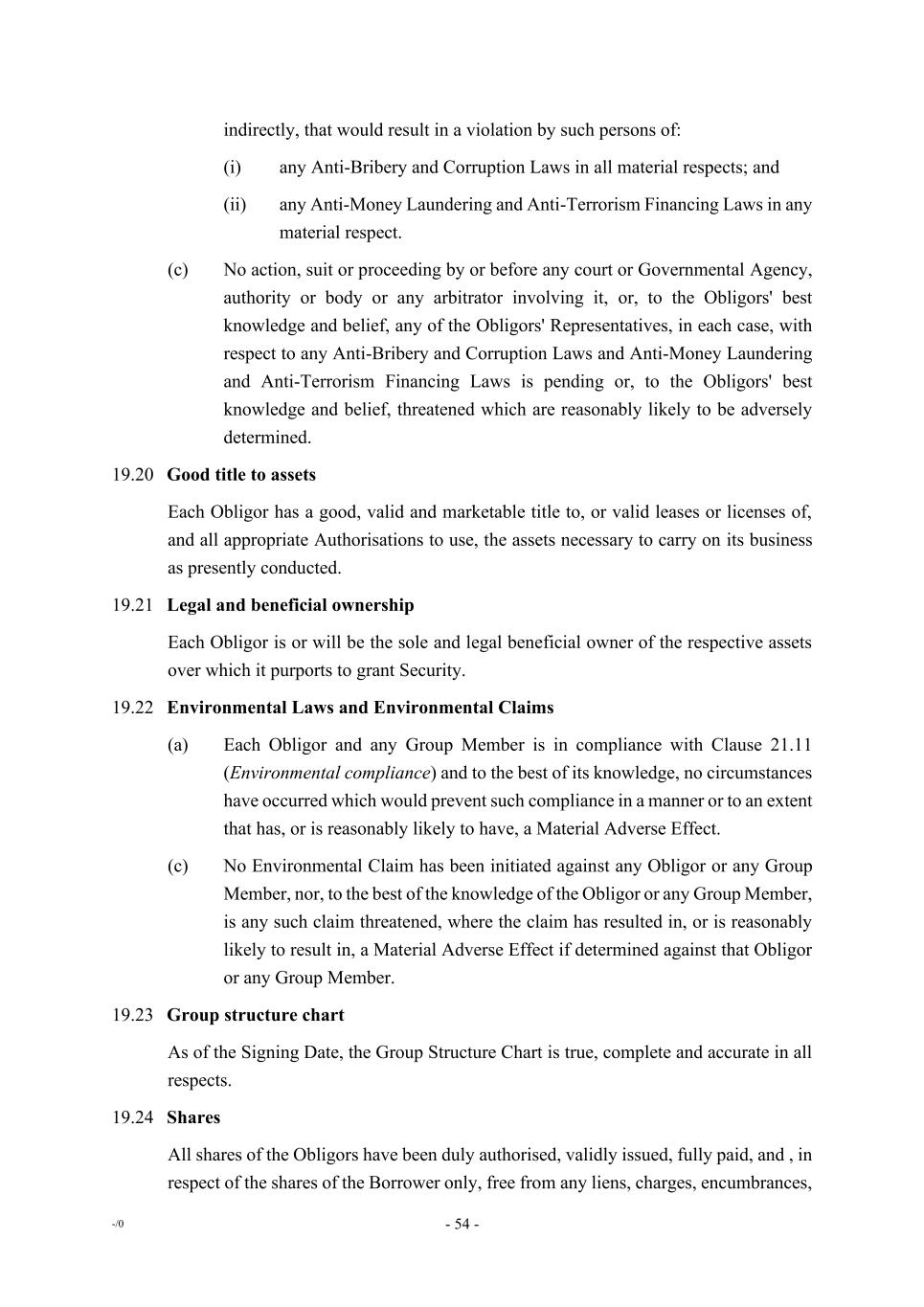 -/0 - 54 - indirectly, that would result in a violation by such persons of: (i) any Anti-Bribery and Corruption Laws in all material respects; and (ii) any Anti-Money Laundering and Anti-Terrorism Financing Laws in any material respect. (c) No action, suit or proceeding by or before any court or Governmental Agency, authority or body or any arbitrator involving it, or, to the Obligors' best knowledge and belief, any of the Obligors' Representatives, in each case, with respect to any Anti-Bribery and Corruption Laws and Anti-Money Laundering and Anti-Terrorism Financing Laws is pending or, to the Obligors' best knowledge and belief, threatened which are reasonably likely to be adversely determined. 19.20 Good title to assets Each Obligor has a good, valid and marketable title to, or valid leases or licenses of, and all appropriate Authorisations to use, the assets necessary to carry on its business as presently conducted. 19.21 Legal and beneficial ownership Each Obligor is or will be the sole and legal beneficial owner of the respective assets over which it purports to grant Security. 19.22 Environmental Laws and Environmental Claims (a) Each Obligor and any Group Member is in compliance with Clause 21.11 (Environmental compliance) and to the best of its knowledge, no circumstances have occurred which would prevent such compliance in a manner or to an extent that has, or is reasonably likely to have, a Material Adverse Effect. (c) No Environmental Claim has been initiated against any Obligor or any Group Member, nor, to the best of the knowledge of the Obligor or any Group Member, is any such claim threatened, where the claim has resulted in, or is reasonably likely to result in, a Material Adverse Effect if determined against that Obligor or any Group Member. 19.23 Group structure chart As of the Signing Date, the Group Structure Chart is true, complete and accurate in all respects. 19.24 Shares All shares of the Obligors have been duly authorised, validly issued, fully paid, and , in respect of the shares of the Borrower only, free from any liens, charges, encumbrances,