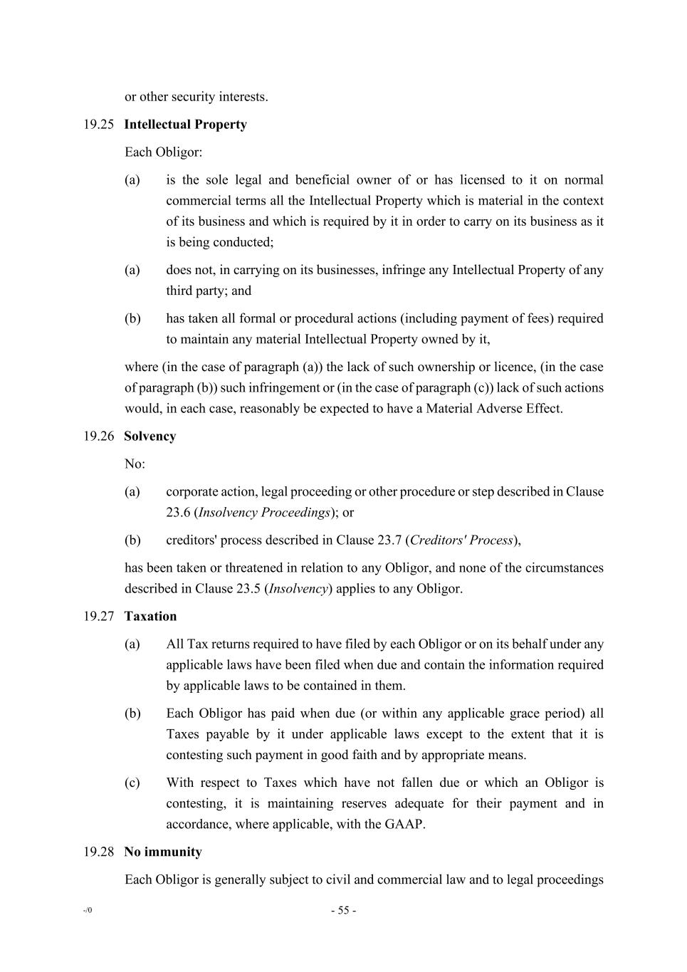 -/0 - 55 - or other security interests. 19.25 Intellectual Property Each Obligor: (a) is the sole legal and beneficial owner of or has licensed to it on normal commercial terms all the Intellectual Property which is material in the context of its business and which is required by it in order to carry on its business as it is being conducted; (a) does not, in carrying on its businesses, infringe any Intellectual Property of any third party; and (b) has taken all formal or procedural actions (including payment of fees) required to maintain any material Intellectual Property owned by it, where (in the case of paragraph (a)) the lack of such ownership or licence, (in the case of paragraph (b)) such infringement or (in the case of paragraph (c)) lack of such actions would, in each case, reasonably be expected to have a Material Adverse Effect. 19.26 Solvency No: (a) corporate action, legal proceeding or other procedure or step described in Clause 23.6 (Insolvency Proceedings); or (b) creditors' process described in Clause 23.7 (Creditors' Process), has been taken or threatened in relation to any Obligor, and none of the circumstances described in Clause 23.5 (Insolvency) applies to any Obligor. 19.27 Taxation (a) All Tax returns required to have filed by each Obligor or on its behalf under any applicable laws have been filed when due and contain the information required by applicable laws to be contained in them. (b) Each Obligor has paid when due (or within any applicable grace period) all Taxes payable by it under applicable laws except to the extent that it is contesting such payment in good faith and by appropriate means. (c) With respect to Taxes which have not fallen due or which an Obligor is contesting, it is maintaining reserves adequate for their payment and in accordance, where applicable, with the GAAP. 19.28 No immunity Each Obligor is generally subject to civil and commercial law and to legal proceedings