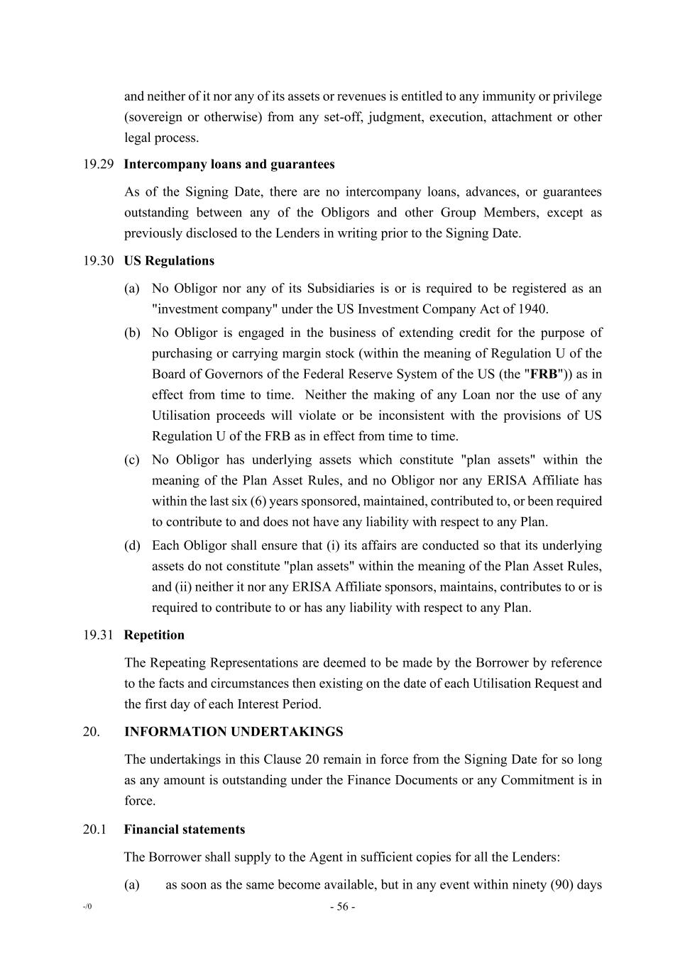 -/0 - 56 - and neither of it nor any of its assets or revenues is entitled to any immunity or privilege (sovereign or otherwise) from any set-off, judgment, execution, attachment or other legal process. 19.29 Intercompany loans and guarantees As of the Signing Date, there are no intercompany loans, advances, or guarantees outstanding between any of the Obligors and other Group Members, except as previously disclosed to the Lenders in writing prior to the Signing Date. 19.30 US Regulations (a) No Obligor nor any of its Subsidiaries is or is required to be registered as an "investment company" under the US Investment Company Act of 1940. (b) No Obligor is engaged in the business of extending credit for the purpose of purchasing or carrying margin stock (within the meaning of Regulation U of the Board of Governors of the Federal Reserve System of the US (the "FRB")) as in effect from time to time. Neither the making of any Loan nor the use of any Utilisation proceeds will violate or be inconsistent with the provisions of US Regulation U of the FRB as in effect from time to time. (c) No Obligor has underlying assets which constitute "plan assets" within the meaning of the Plan Asset Rules, and no Obligor nor any ERISA Affiliate has within the last six (6) years sponsored, maintained, contributed to, or been required to contribute to and does not have any liability with respect to any Plan. (d) Each Obligor shall ensure that (i) its affairs are conducted so that its underlying assets do not constitute "plan assets" within the meaning of the Plan Asset Rules, and (ii) neither it nor any ERISA Affiliate sponsors, maintains, contributes to or is required to contribute to or has any liability with respect to any Plan. 19.31 Repetition The Repeating Representations are deemed to be made by the Borrower by reference to the facts and circumstances then existing on the date of each Utilisation Request and the first day of each Interest Period. 20. INFORMATION UNDERTAKINGS The undertakings in this Clause 20 remain in force from the Signing Date for so long as any amount is outstanding under the Finance Documents or any Commitment is in force. 20.1 Financial statements The Borrower shall supply to the Agent in sufficient copies for all the Lenders: (a) as soon as the same become available, but in any event within ninety (90) days