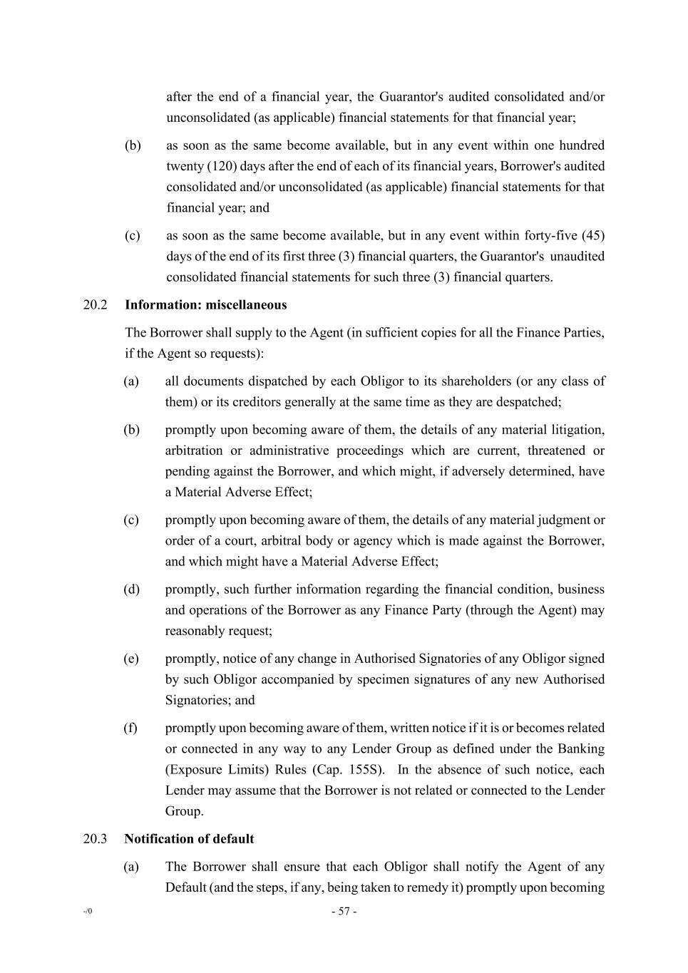 -/0 - 57 - after the end of a financial year, the Guarantor's audited consolidated and/or unconsolidated (as applicable) financial statements for that financial year; (b) as soon as the same become available, but in any event within one hundred twenty (120) days after the end of each of its financial years, Borrower's audited consolidated and/or unconsolidated (as applicable) financial statements for that financial year; and (c) as soon as the same become available, but in any event within forty-five (45) days of the end of its first three (3) financial quarters, the Guarantor's unaudited consolidated financial statements for such three (3) financial quarters. 20.2 Information: miscellaneous The Borrower shall supply to the Agent (in sufficient copies for all the Finance Parties, if the Agent so requests): (a) all documents dispatched by each Obligor to its shareholders (or any class of them) or its creditors generally at the same time as they are despatched; (b) promptly upon becoming aware of them, the details of any material litigation, arbitration or administrative proceedings which are current, threatened or pending against the Borrower, and which might, if adversely determined, have a Material Adverse Effect; (c) promptly upon becoming aware of them, the details of any material judgment or order of a court, arbitral body or agency which is made against the Borrower, and which might have a Material Adverse Effect; (d) promptly, such further information regarding the financial condition, business and operations of the Borrower as any Finance Party (through the Agent) may reasonably request; (e) promptly, notice of any change in Authorised Signatories of any Obligor signed by such Obligor accompanied by specimen signatures of any new Authorised Signatories; and (f) promptly upon becoming aware of them, written notice if it is or becomes related or connected in any way to any Lender Group as defined under the Banking (Exposure Limits) Rules (Cap. 155S). In the absence of such notice, each Lender may assume that the Borrower is not related or connected to the Lender Group. 20.3 Notification of default (a) The Borrower shall ensure that each Obligor shall notify the Agent of any Default (and the steps, if any, being taken to remedy it) promptly upon becoming