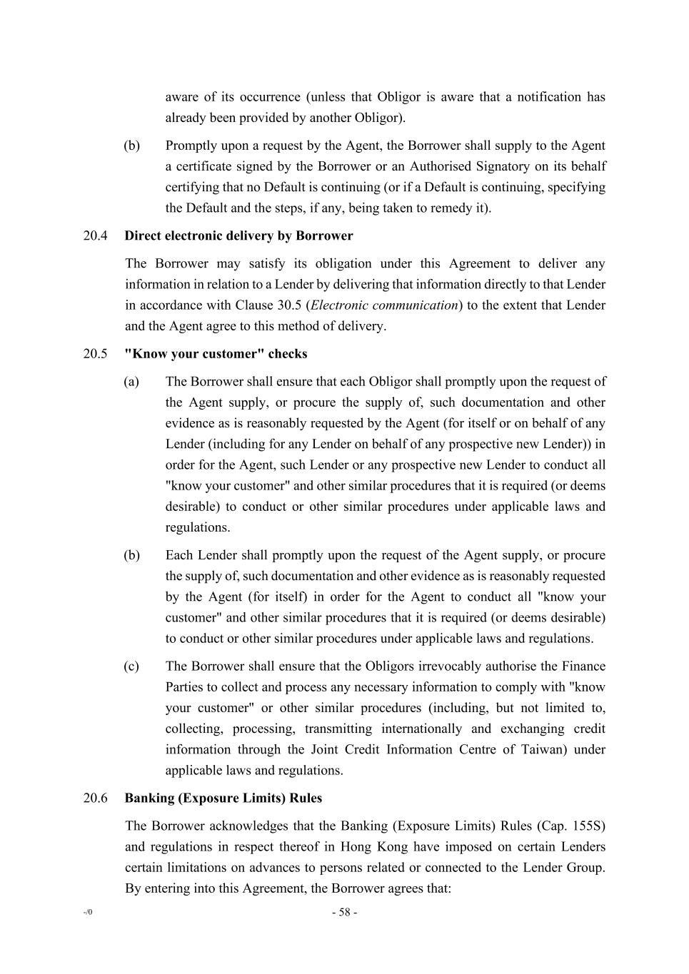 -/0 - 58 - aware of its occurrence (unless that Obligor is aware that a notification has already been provided by another Obligor). (b) Promptly upon a request by the Agent, the Borrower shall supply to the Agent a certificate signed by the Borrower or an Authorised Signatory on its behalf certifying that no Default is continuing (or if a Default is continuing, specifying the Default and the steps, if any, being taken to remedy it). 20.4 Direct electronic delivery by Borrower The Borrower may satisfy its obligation under this Agreement to deliver any information in relation to a Lender by delivering that information directly to that Lender in accordance with Clause 30.5 (Electronic communication) to the extent that Lender and the Agent agree to this method of delivery. 20.5 "Know your customer" checks (a) The Borrower shall ensure that each Obligor shall promptly upon the request of the Agent supply, or procure the supply of, such documentation and other evidence as is reasonably requested by the Agent (for itself or on behalf of any Lender (including for any Lender on behalf of any prospective new Lender)) in order for the Agent, such Lender or any prospective new Lender to conduct all "know your customer" and other similar procedures that it is required (or deems desirable) to conduct or other similar procedures under applicable laws and regulations. (b) Each Lender shall promptly upon the request of the Agent supply, or procure the supply of, such documentation and other evidence as is reasonably requested by the Agent (for itself) in order for the Agent to conduct all "know your customer" and other similar procedures that it is required (or deems desirable) to conduct or other similar procedures under applicable laws and regulations. (c) The Borrower shall ensure that the Obligors irrevocably authorise the Finance Parties to collect and process any necessary information to comply with "know your customer" or other similar procedures (including, but not limited to, collecting, processing, transmitting internationally and exchanging credit information through the Joint Credit Information Centre of Taiwan) under applicable laws and regulations. 20.6 Banking (Exposure Limits) Rules The Borrower acknowledges that the Banking (Exposure Limits) Rules (Cap. 155S) and regulations in respect thereof in Hong Kong have imposed on certain Lenders certain limitations on advances to persons related or connected to the Lender Group. By entering into this Agreement, the Borrower agrees that: