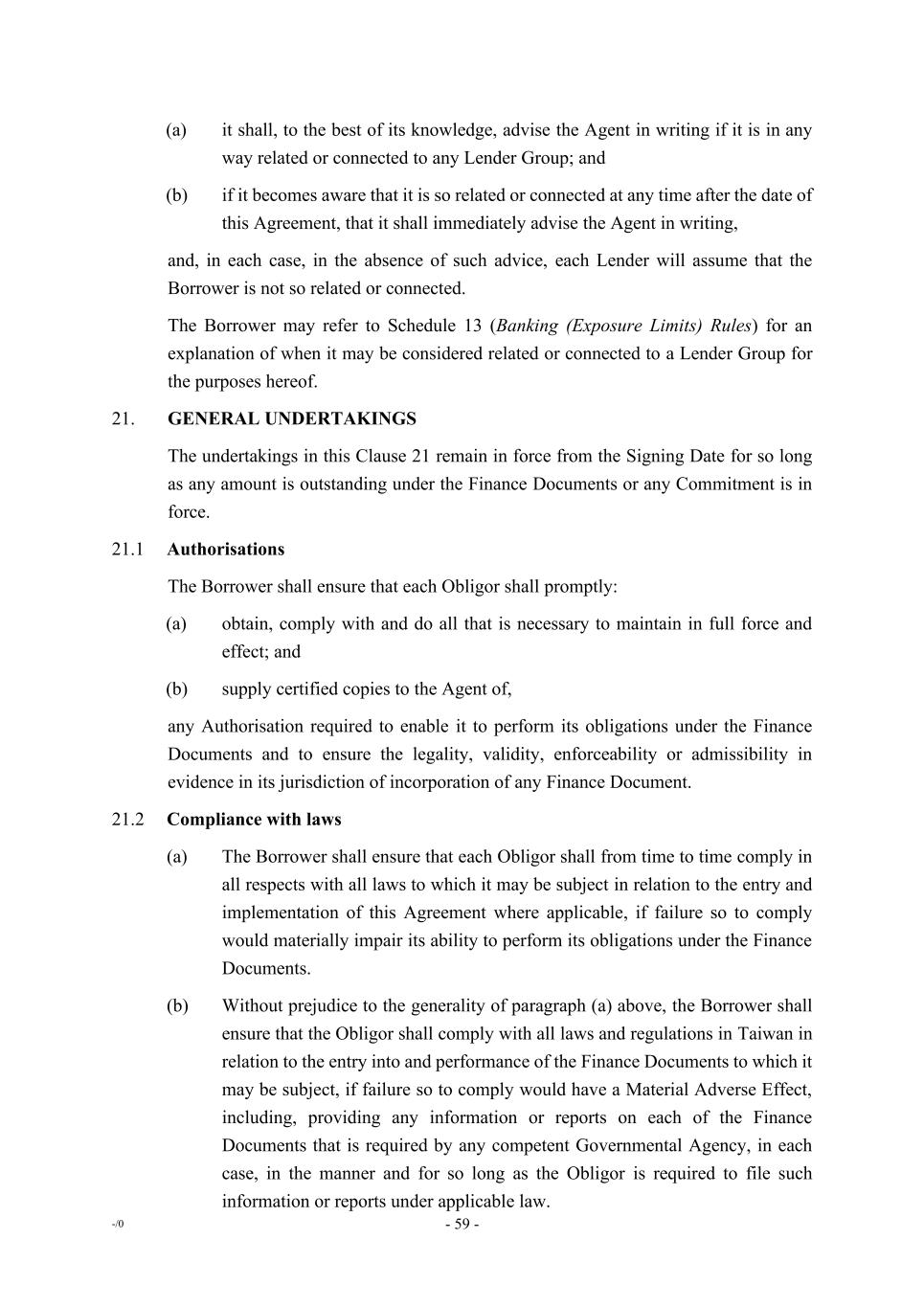 -/0 - 59 - (a) it shall, to the best of its knowledge, advise the Agent in writing if it is in any way related or connected to any Lender Group; and (b) if it becomes aware that it is so related or connected at any time after the date of this Agreement, that it shall immediately advise the Agent in writing, and, in each case, in the absence of such advice, each Lender will assume that the Borrower is not so related or connected. The Borrower may refer to Schedule 13 (Banking (Exposure Limits) Rules) for an explanation of when it may be considered related or connected to a Lender Group for the purposes hereof. 21. GENERAL UNDERTAKINGS The undertakings in this Clause 21 remain in force from the Signing Date for so long as any amount is outstanding under the Finance Documents or any Commitment is in force. 21.1 Authorisations The Borrower shall ensure that each Obligor shall promptly: (a) obtain, comply with and do all that is necessary to maintain in full force and effect; and (b) supply certified copies to the Agent of, any Authorisation required to enable it to perform its obligations under the Finance Documents and to ensure the legality, validity, enforceability or admissibility in evidence in its jurisdiction of incorporation of any Finance Document. 21.2 Compliance with laws (a) The Borrower shall ensure that each Obligor shall from time to time comply in all respects with all laws to which it may be subject in relation to the entry and implementation of this Agreement where applicable, if failure so to comply would materially impair its ability to perform its obligations under the Finance Documents. (b) Without prejudice to the generality of paragraph (a) above, the Borrower shall ensure that the Obligor shall comply with all laws and regulations in Taiwan in relation to the entry into and performance of the Finance Documents to which it may be subject, if failure so to comply would have a Material Adverse Effect, including, providing any information or reports on each of the Finance Documents that is required by any competent Governmental Agency, in each case, in the manner and for so long as the Obligor is required to file such information or reports under applicable law.