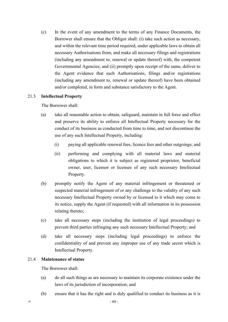 -/0 - 60 - (c) In the event of any amendment to the terms of any Finance Documents, the Borrower shall ensure that the Obligor shall: (i) take such action as necessary, and within the relevant time period required, under applicable laws to obtain all necessary Authorisations from, and make all necessary filings and registrations (including any amendment to, renewal or update thereof) with, the competent Governmental Agencies; and (ii) promptly upon receipt of the same, deliver to the Agent evidence that such Authorisations, filings and/or registrations (including any amendment to, renewal or update thereof) have been obtained and/or completed, in form and substance satisfactory to the Agent. 21.3 Intellectual Property The Borrower shall: (a) take all reasonable action to obtain, safeguard, maintain in full force and effect and preserve its ability to enforce all Intellectual Property necessary for the conduct of its business as conducted from time to time, and not discontinue the use of any such Intellectual Property, including: (i) paying all applicable renewal fees, licence fees and other outgoings; and (ii) performing and complying with all material laws and material obligations to which it is subject as registered proprietor, beneficial owner, user, licensor or licensee of any such necessary Intellectual Property. (b) promptly notify the Agent of any material infringement or threatened or suspected material infringement of or any challenge to the validity of any such necessary Intellectual Property owned by or licensed to it which may come to its notice, supply the Agent (if requested) with all information in its possession relating thereto; (c) take all necessary steps (including the institution of legal proceedings) to prevent third parties infringing any such necessary Intellectual Property; and (d) take all necessary steps (including legal proceedings) to enforce the confidentiality of and prevent any improper use of any trade secret which is Intellectual Property. 21.4 Maintenance of status The Borrower shall: (a) do all such things as are necessary to maintain its corporate existence under the laws of its jurisdiction of incorporation; and (b) ensure that it has the right and is duly qualified to conduct its business as it is