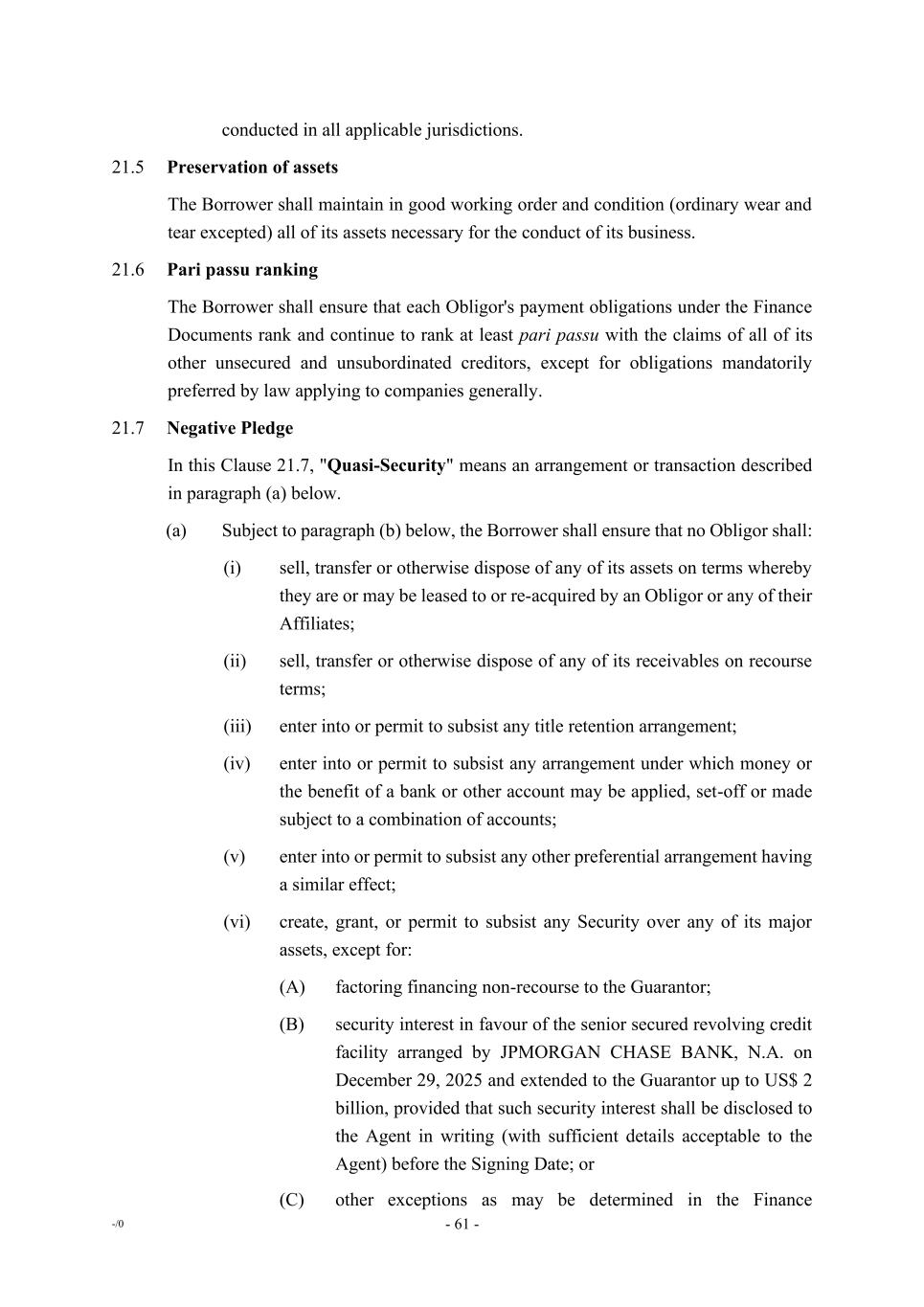 -/0 - 61 - conducted in all applicable jurisdictions. 21.5 Preservation of assets The Borrower shall maintain in good working order and condition (ordinary wear and tear excepted) all of its assets necessary for the conduct of its business. 21.6 Pari passu ranking The Borrower shall ensure that each Obligor's payment obligations under the Finance Documents rank and continue to rank at least pari passu with the claims of all of its other unsecured and unsubordinated creditors, except for obligations mandatorily preferred by law applying to companies generally. 21.7 Negative Pledge In this Clause 21.7, "Quasi-Security" means an arrangement or transaction described in paragraph (a) below. (a) Subject to paragraph (b) below, the Borrower shall ensure that no Obligor shall: (i) sell, transfer or otherwise dispose of any of its assets on terms whereby they are or may be leased to or re-acquired by an Obligor or any of their Affiliates; (ii) sell, transfer or otherwise dispose of any of its receivables on recourse terms; (iii) enter into or permit to subsist any title retention arrangement; (iv) enter into or permit to subsist any arrangement under which money or the benefit of a bank or other account may be applied, set-off or made subject to a combination of accounts; (v) enter into or permit to subsist any other preferential arrangement having a similar effect; (vi) create, grant, or permit to subsist any Security over any of its major assets, except for: (A) factoring financing non-recourse to the Guarantor; (B) security interest in favour of the senior secured revolving credit facility arranged by JPMORGAN CHASE BANK, N.A. on December 29, 2025 and extended to the Guarantor up to US$ 2 billion, provided that such security interest shall be disclosed to the Agent in writing (with sufficient details acceptable to the Agent) before the Signing Date; or (C) other exceptions as may be determined in the Finance