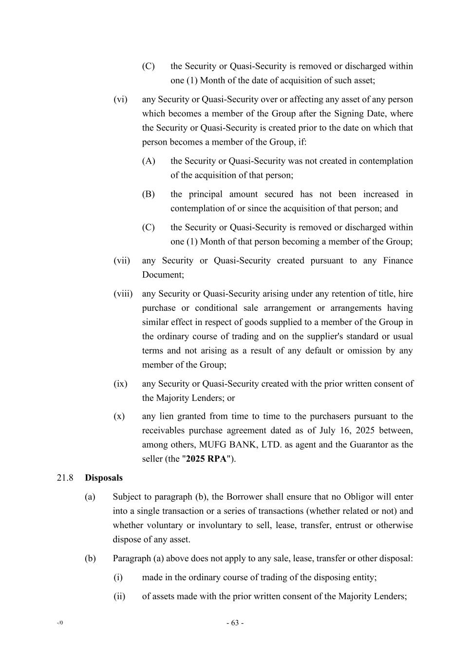-/0 - 63 - (C) the Security or Quasi-Security is removed or discharged within one (1) Month of the date of acquisition of such asset; (vi) any Security or Quasi-Security over or affecting any asset of any person which becomes a member of the Group after the Signing Date, where the Security or Quasi-Security is created prior to the date on which that person becomes a member of the Group, if: (A) the Security or Quasi-Security was not created in contemplation of the acquisition of that person; (B) the principal amount secured has not been increased in contemplation of or since the acquisition of that person; and (C) the Security or Quasi-Security is removed or discharged within one (1) Month of that person becoming a member of the Group; (vii) any Security or Quasi-Security created pursuant to any Finance Document; (viii) any Security or Quasi-Security arising under any retention of title, hire purchase or conditional sale arrangement or arrangements having similar effect in respect of goods supplied to a member of the Group in the ordinary course of trading and on the supplier's standard or usual terms and not arising as a result of any default or omission by any member of the Group; (ix) any Security or Quasi-Security created with the prior written consent of the Majority Lenders; or (x) any lien granted from time to time to the purchasers pursuant to the receivables purchase agreement dated as of July 16, 2025 between, among others, MUFG BANK, LTD. as agent and the Guarantor as the seller (the "2025 RPA"). 21.8 Disposals (a) Subject to paragraph (b), the Borrower shall ensure that no Obligor will enter into a single transaction or a series of transactions (whether related or not) and whether voluntary or involuntary to sell, lease, transfer, entrust or otherwise dispose of any asset. (b) Paragraph (a) above does not apply to any sale, lease, transfer or other disposal: (i) made in the ordinary course of trading of the disposing entity; (ii) of assets made with the prior written consent of the Majority Lenders;