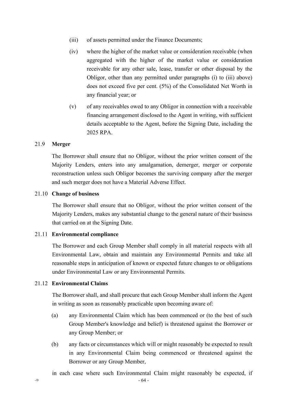 -/0 - 64 - (iii) of assets permitted under the Finance Documents; (iv) where the higher of the market value or consideration receivable (when aggregated with the higher of the market value or consideration receivable for any other sale, lease, transfer or other disposal by the Obligor, other than any permitted under paragraphs (i) to (iii) above) does not exceed five per cent. (5%) of the Consolidated Net Worth in any financial year; or (v) of any receivables owed to any Obligor in connection with a receivable financing arrangement disclosed to the Agent in writing, with sufficient details acceptable to the Agent, before the Signing Date, including the 2025 RPA. 21.9 Merger The Borrower shall ensure that no Obligor, without the prior written consent of the Majority Lenders, enters into any amalgamation, demerger, merger or corporate reconstruction unless such Obligor becomes the surviving company after the merger and such merger does not have a Material Adverse Effect. 21.10 Change of business The Borrower shall ensure that no Obligor, without the prior written consent of the Majority Lenders, makes any substantial change to the general nature of their business that carried on at the Signing Date. 21.11 Environmental compliance The Borrower and each Group Member shall comply in all material respects with all Environmental Law, obtain and maintain any Environmental Permits and take all reasonable steps in anticipation of known or expected future changes to or obligations under Environmental Law or any Environmental Permits. 21.12 Environmental Claims The Borrower shall, and shall procure that each Group Member shall inform the Agent in writing as soon as reasonably practicable upon becoming aware of: (a) any Environmental Claim which has been commenced or (to the best of such Group Member's knowledge and belief) is threatened against the Borrower or any Group Member; or (b) any facts or circumstances which will or might reasonably be expected to result in any Environmental Claim being commenced or threatened against the Borrower or any Group Member, in each case where such Environmental Claim might reasonably be expected, if