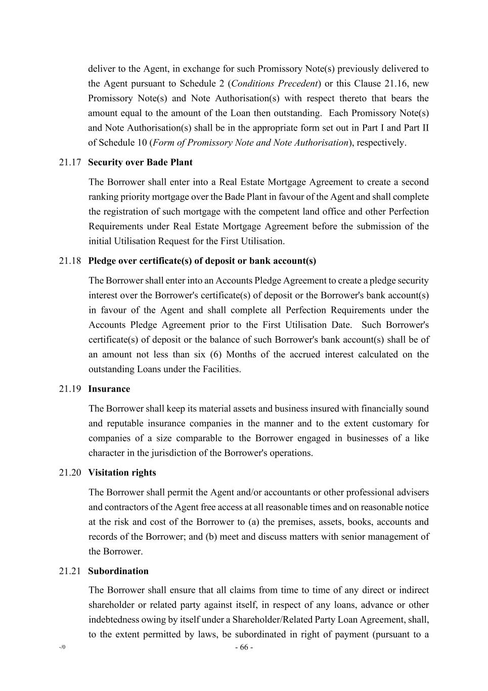 -/0 - 66 - deliver to the Agent, in exchange for such Promissory Note(s) previously delivered to the Agent pursuant to Schedule 2 (Conditions Precedent) or this Clause 21.16, new Promissory Note(s) and Note Authorisation(s) with respect thereto that bears the amount equal to the amount of the Loan then outstanding. Each Promissory Note(s) and Note Authorisation(s) shall be in the appropriate form set out in Part I and Part II of Schedule 10 (Form of Promissory Note and Note Authorisation), respectively. 21.17 Security over Bade Plant The Borrower shall enter into a Real Estate Mortgage Agreement to create a second ranking priority mortgage over the Bade Plant in favour of the Agent and shall complete the registration of such mortgage with the competent land office and other Perfection Requirements under Real Estate Mortgage Agreement before the submission of the initial Utilisation Request for the First Utilisation. 21.18 Pledge over certificate(s) of deposit or bank account(s) The Borrower shall enter into an Accounts Pledge Agreement to create a pledge security interest over the Borrower's certificate(s) of deposit or the Borrower's bank account(s) in favour of the Agent and shall complete all Perfection Requirements under the Accounts Pledge Agreement prior to the First Utilisation Date. Such Borrower's certificate(s) of deposit or the balance of such Borrower's bank account(s) shall be of an amount not less than six (6) Months of the accrued interest calculated on the outstanding Loans under the Facilities. 21.19 Insurance The Borrower shall keep its material assets and business insured with financially sound and reputable insurance companies in the manner and to the extent customary for companies of a size comparable to the Borrower engaged in businesses of a like character in the jurisdiction of the Borrower's operations. 21.20 Visitation rights The Borrower shall permit the Agent and/or accountants or other professional advisers and contractors of the Agent free access at all reasonable times and on reasonable notice at the risk and cost of the Borrower to (a) the premises, assets, books, accounts and records of the Borrower; and (b) meet and discuss matters with senior management of the Borrower. 21.21 Subordination The Borrower shall ensure that all claims from time to time of any direct or indirect shareholder or related party against itself, in respect of any loans, advance or other indebtedness owing by itself under a Shareholder/Related Party Loan Agreement, shall, to the extent permitted by laws, be subordinated in right of payment (pursuant to a
