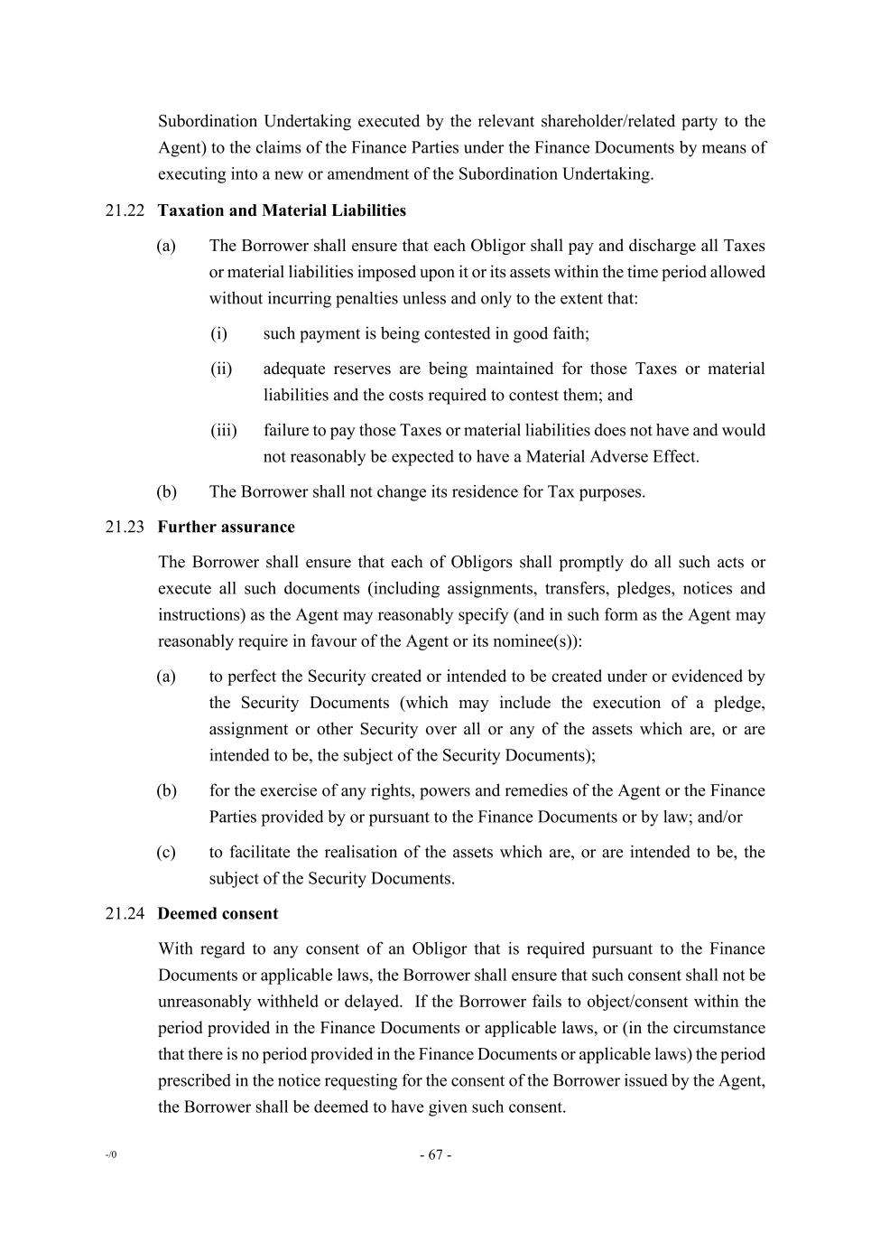 -/0 - 67 - Subordination Undertaking executed by the relevant shareholder/related party to the Agent) to the claims of the Finance Parties under the Finance Documents by means of executing into a new or amendment of the Subordination Undertaking. 21.22 Taxation and Material Liabilities (a) The Borrower shall ensure that each Obligor shall pay and discharge all Taxes or material liabilities imposed upon it or its assets within the time period allowed without incurring penalties unless and only to the extent that: (i) such payment is being contested in good faith; (ii) adequate reserves are being maintained for those Taxes or material liabilities and the costs required to contest them; and (iii) failure to pay those Taxes or material liabilities does not have and would not reasonably be expected to have a Material Adverse Effect. (b) The Borrower shall not change its residence for Tax purposes. 21.23 Further assurance The Borrower shall ensure that each of Obligors shall promptly do all such acts or execute all such documents (including assignments, transfers, pledges, notices and instructions) as the Agent may reasonably specify (and in such form as the Agent may reasonably require in favour of the Agent or its nominee(s)): (a) to perfect the Security created or intended to be created under or evidenced by the Security Documents (which may include the execution of a pledge, assignment or other Security over all or any of the assets which are, or are intended to be, the subject of the Security Documents); (b) for the exercise of any rights, powers and remedies of the Agent or the Finance Parties provided by or pursuant to the Finance Documents or by law; and/or (c) to facilitate the realisation of the assets which are, or are intended to be, the subject of the Security Documents. 21.24 Deemed consent With regard to any consent of an Obligor that is required pursuant to the Finance Documents or applicable laws, the Borrower shall ensure that such consent shall not be unreasonably withheld or delayed. If the Borrower fails to object/consent within the period provided in the Finance Documents or applicable laws, or (in the circumstance that there is no period provided in the Finance Documents or applicable laws) the period prescribed in the notice requesting for the consent of the Borrower issued by the Agent, the Borrower shall be deemed to have given such consent.