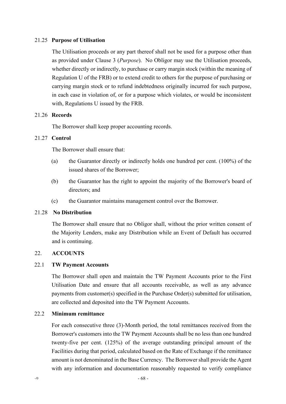 -/0 - 68 - 21.25 Purpose of Utilisation The Utilisation proceeds or any part thereof shall not be used for a purpose other than as provided under Clause 3 (Purpose). No Obligor may use the Utilisation proceeds, whether directly or indirectly, to purchase or carry margin stock (within the meaning of Regulation U of the FRB) or to extend credit to others for the purpose of purchasing or carrying margin stock or to refund indebtedness originally incurred for such purpose, in each case in violation of, or for a purpose which violates, or would be inconsistent with, Regulations U issued by the FRB. 21.26 Records The Borrower shall keep proper accounting records. 21.27 Control The Borrower shall ensure that: (a) the Guarantor directly or indirectly holds one hundred per cent. (100%) of the issued shares of the Borrower; (b) the Guarantor has the right to appoint the majority of the Borrower's board of directors; and (c) the Guarantor maintains management control over the Borrower. 21.28 No Distribution The Borrower shall ensure that no Obligor shall, without the prior written consent of the Majority Lenders, make any Distribution while an Event of Default has occurred and is continuing. 22. ACCOUNTS 22.1 TW Payment Accounts The Borrower shall open and maintain the TW Payment Accounts prior to the First Utilisation Date and ensure that all accounts receivable, as well as any advance payments from customer(s) specified in the Purchase Order(s) submitted for utilisation, are collected and deposited into the TW Payment Accounts. 22.2 Minimum remittance For each consecutive three (3)-Month period, the total remittances received from the Borrower's customers into the TW Payment Accounts shall be no less than one hundred twenty-five per cent. (125%) of the average outstanding principal amount of the Facilities during that period, calculated based on the Rate of Exchange if the remittance amount is not denominated in the Base Currency. The Borrower shall provide the Agent with any information and documentation reasonably requested to verify compliance