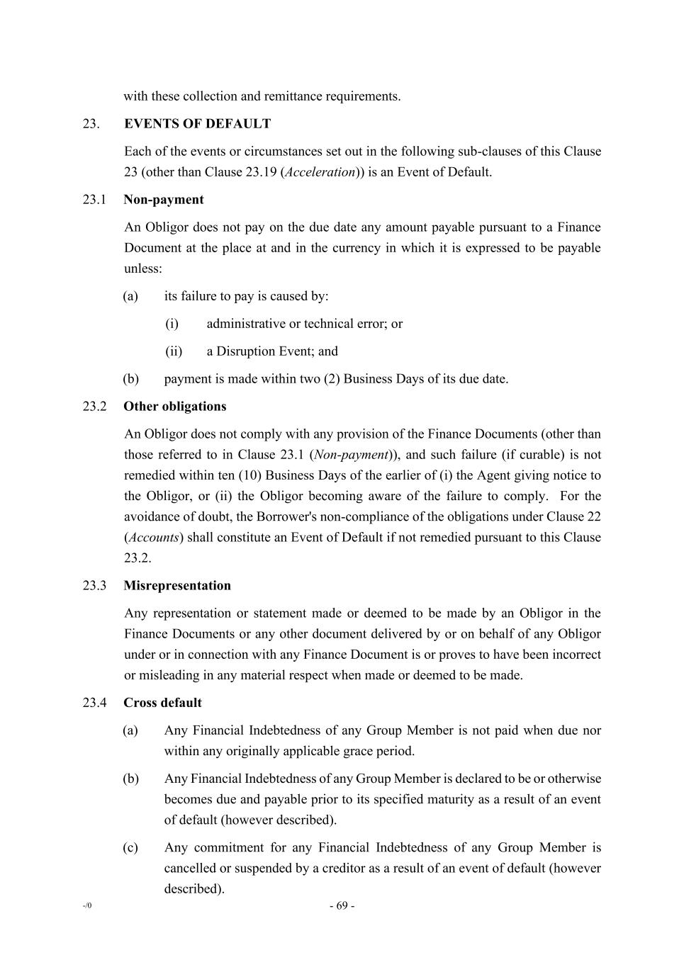-/0 - 69 - with these collection and remittance requirements. 23. EVENTS OF DEFAULT Each of the events or circumstances set out in the following sub-clauses of this Clause 23 (other than Clause 23.19 (Acceleration)) is an Event of Default. 23.1 Non-payment An Obligor does not pay on the due date any amount payable pursuant to a Finance Document at the place at and in the currency in which it is expressed to be payable unless: (a) its failure to pay is caused by: (i) administrative or technical error; or (ii) a Disruption Event; and (b) payment is made within two (2) Business Days of its due date. 23.2 Other obligations An Obligor does not comply with any provision of the Finance Documents (other than those referred to in Clause 23.1 (Non-payment)), and such failure (if curable) is not remedied within ten (10) Business Days of the earlier of (i) the Agent giving notice to the Obligor, or (ii) the Obligor becoming aware of the failure to comply. For the avoidance of doubt, the Borrower's non-compliance of the obligations under Clause 22 (Accounts) shall constitute an Event of Default if not remedied pursuant to this Clause 23.2. 23.3 Misrepresentation Any representation or statement made or deemed to be made by an Obligor in the Finance Documents or any other document delivered by or on behalf of any Obligor under or in connection with any Finance Document is or proves to have been incorrect or misleading in any material respect when made or deemed to be made. 23.4 Cross default (a) Any Financial Indebtedness of any Group Member is not paid when due nor within any originally applicable grace period. (b) Any Financial Indebtedness of any Group Member is declared to be or otherwise becomes due and payable prior to its specified maturity as a result of an event of default (however described). (c) Any commitment for any Financial Indebtedness of any Group Member is cancelled or suspended by a creditor as a result of an event of default (however described).