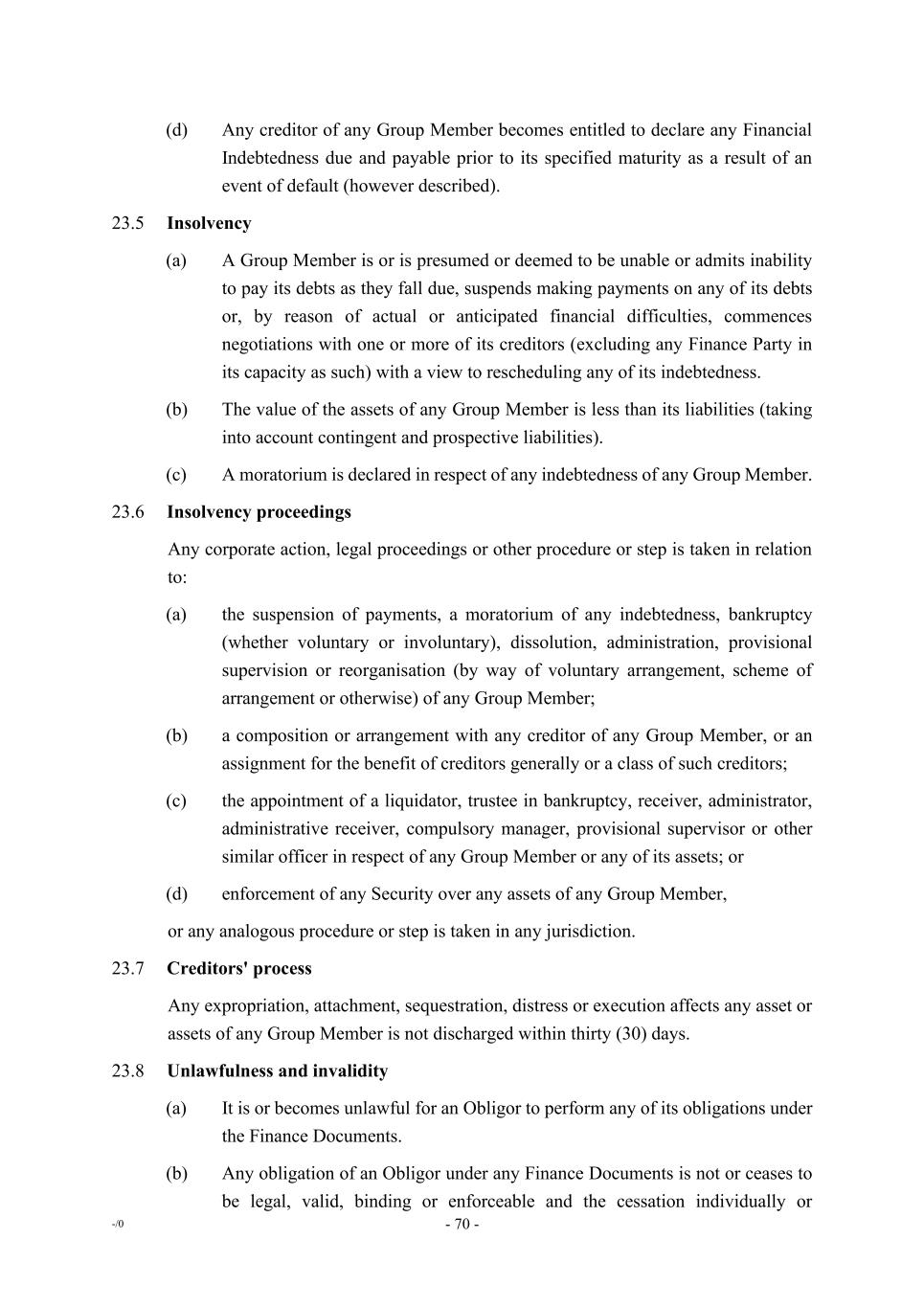-/0 - 70 - (d) Any creditor of any Group Member becomes entitled to declare any Financial Indebtedness due and payable prior to its specified maturity as a result of an event of default (however described). 23.5 Insolvency (a) A Group Member is or is presumed or deemed to be unable or admits inability to pay its debts as they fall due, suspends making payments on any of its debts or, by reason of actual or anticipated financial difficulties, commences negotiations with one or more of its creditors (excluding any Finance Party in its capacity as such) with a view to rescheduling any of its indebtedness. (b) The value of the assets of any Group Member is less than its liabilities (taking into account contingent and prospective liabilities). (c) A moratorium is declared in respect of any indebtedness of any Group Member. 23.6 Insolvency proceedings Any corporate action, legal proceedings or other procedure or step is taken in relation to: (a) the suspension of payments, a moratorium of any indebtedness, bankruptcy (whether voluntary or involuntary), dissolution, administration, provisional supervision or reorganisation (by way of voluntary arrangement, scheme of arrangement or otherwise) of any Group Member; (b) a composition or arrangement with any creditor of any Group Member, or an assignment for the benefit of creditors generally or a class of such creditors; (c) the appointment of a liquidator, trustee in bankruptcy, receiver, administrator, administrative receiver, compulsory manager, provisional supervisor or other similar officer in respect of any Group Member or any of its assets; or (d) enforcement of any Security over any assets of any Group Member, or any analogous procedure or step is taken in any jurisdiction. 23.7 Creditors' process Any expropriation, attachment, sequestration, distress or execution affects any asset or assets of any Group Member is not discharged within thirty (30) days. 23.8 Unlawfulness and invalidity (a) It is or becomes unlawful for an Obligor to perform any of its obligations under the Finance Documents. (b) Any obligation of an Obligor under any Finance Documents is not or ceases to be legal, valid, binding or enforceable and the cessation individually or